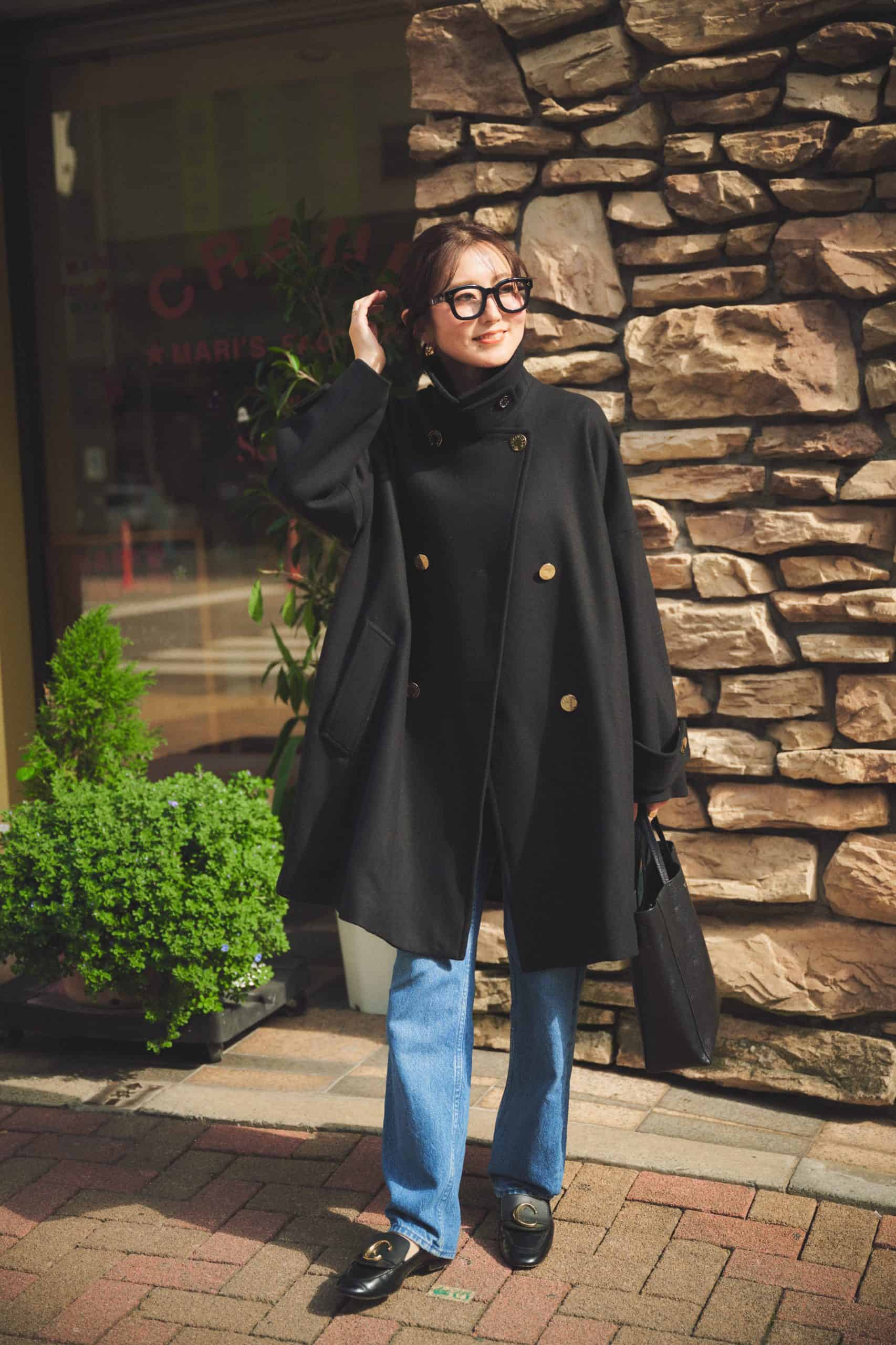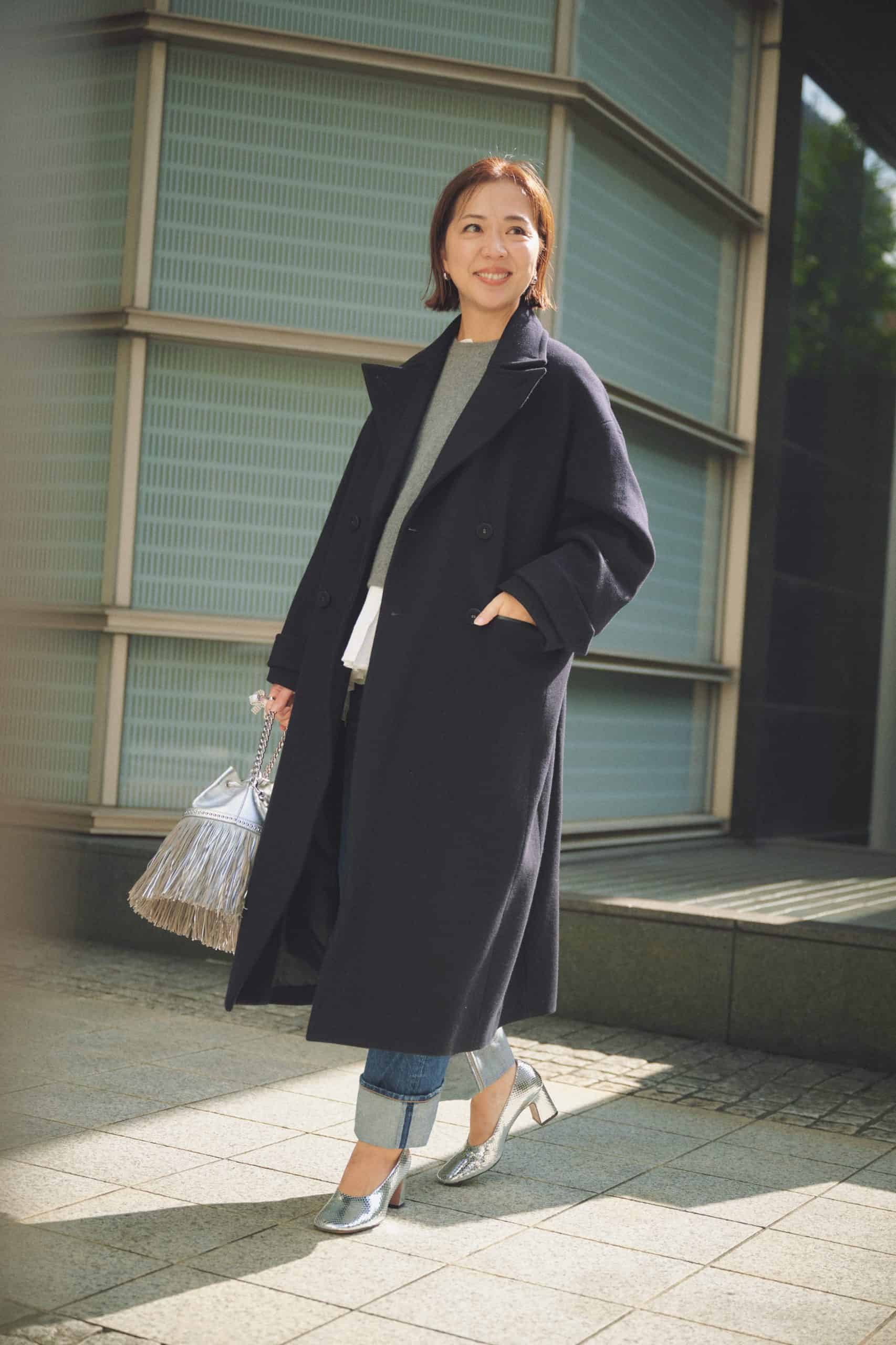 学校用に購入したネイビーのコートですが、シンプルなので日常使いにも頼れるコートです。立ち襟スタイルの2wayで印象を変えられるのでデニム合わせも品よく決まります。デニムは大きくロールアップして足首を覗かせ抜け感を。安定感のある太めヒールを合わせるとカジュアルすぎず“大人の余裕”が生まれます。バッグとパンプスのシルバー合わせがコーデのスパイスに。王道ネイビーコートを今年らしく、大人カジュアルで冬スタイルを楽しみます。