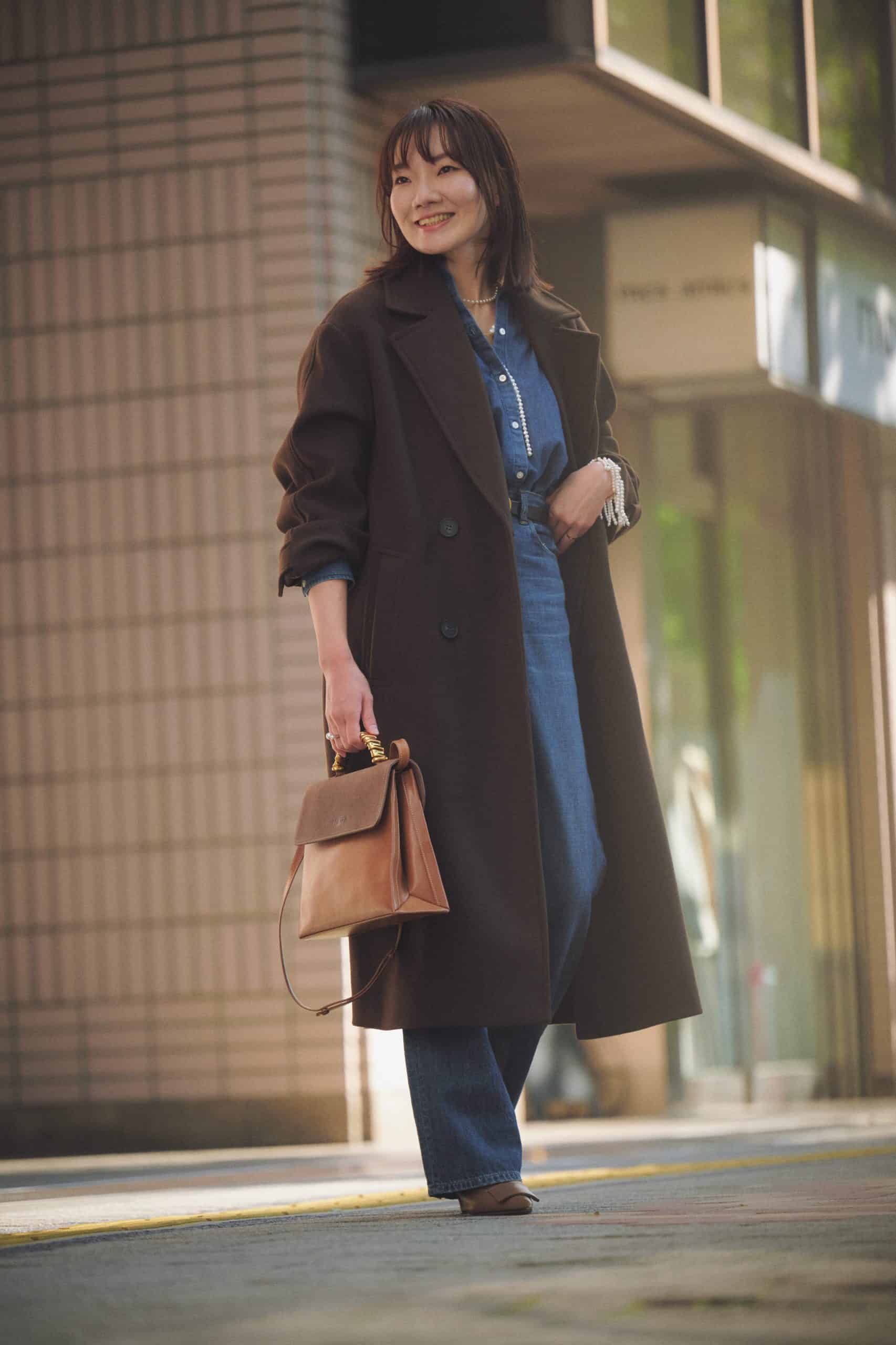 今年コートを新調するなら「トレンドカラーのブラウン一択!」と心に決めていました。ZARAで出合ったチョコレートブラウンのコートは、ブルべ肌にも馴染む理想の一着。ブラウンと好相性なデニムonデニムの上にバサッと羽織って、いつものコーデをハンサムに仕上げました。アクセサリーはパールを重ねづけして、マニッシュな中にエレガントさをプラスしました。