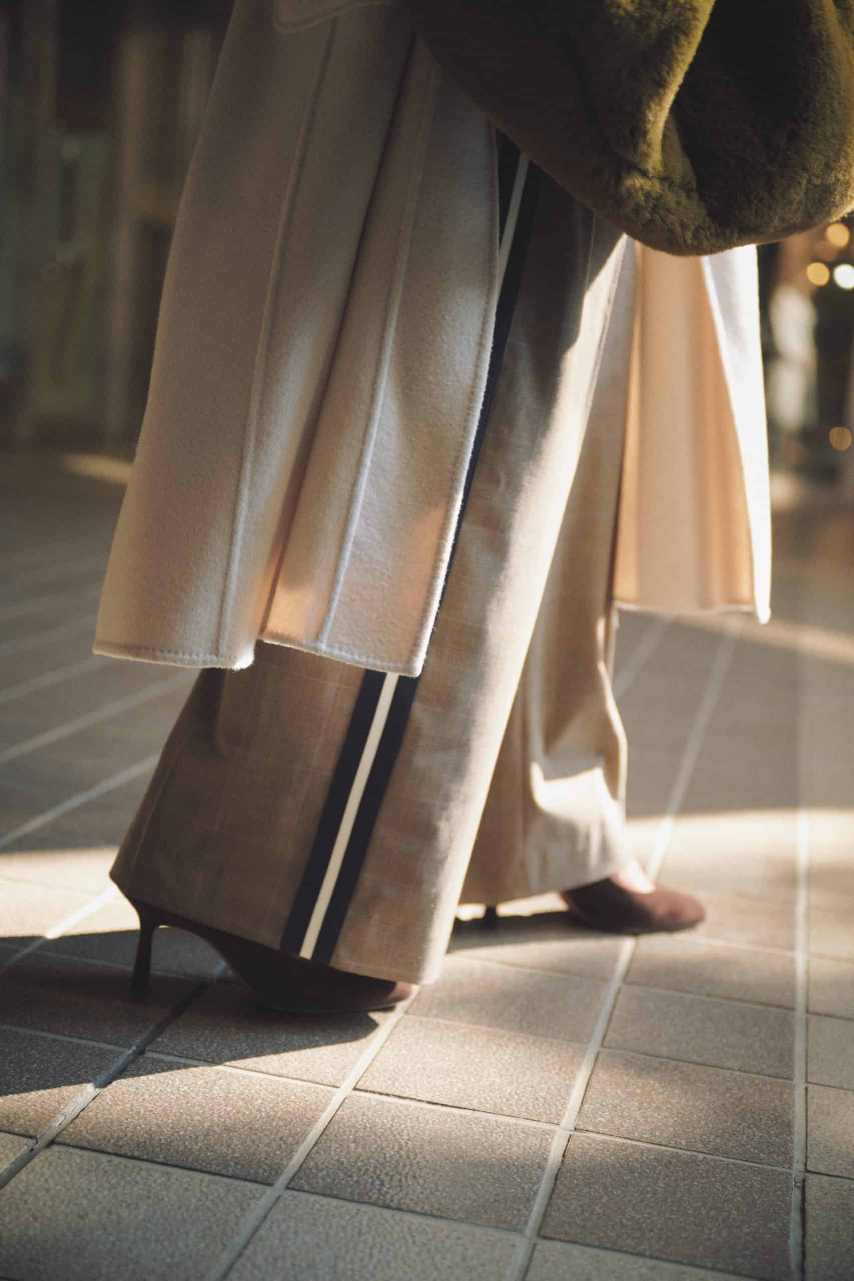 一昨年に購入したebureのコートは一目惚れでした。上質な生地とエクリュカラーが美しく、どんなコーデも受け止めてくれるシンプルなデザインと軽やかさが大活躍で気に入っています。今年追加したラインパンツは、チェック柄に細いラインが入っていて、主張しすぎないのにスタイルアップ見えの優秀パンツです。四角いスクエアヒールを合わせると、ほんのりモードな雰囲気で今年らしさがアップします。