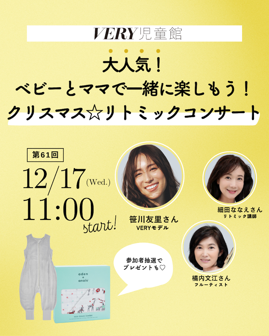 ■内容:今月はVERYモデルの笹川友里さん、リトミック講師の細田ななえさん、フルーティストの橘内文江さん、ゲストピアニストの小林弘子さんがゲストとして登場! VERY児童館の1年を締めくくる大人気のコンテンツ「クリスマスリトミックコンサート」をお家で赤ちゃんと一緒に楽しみましょう♪
