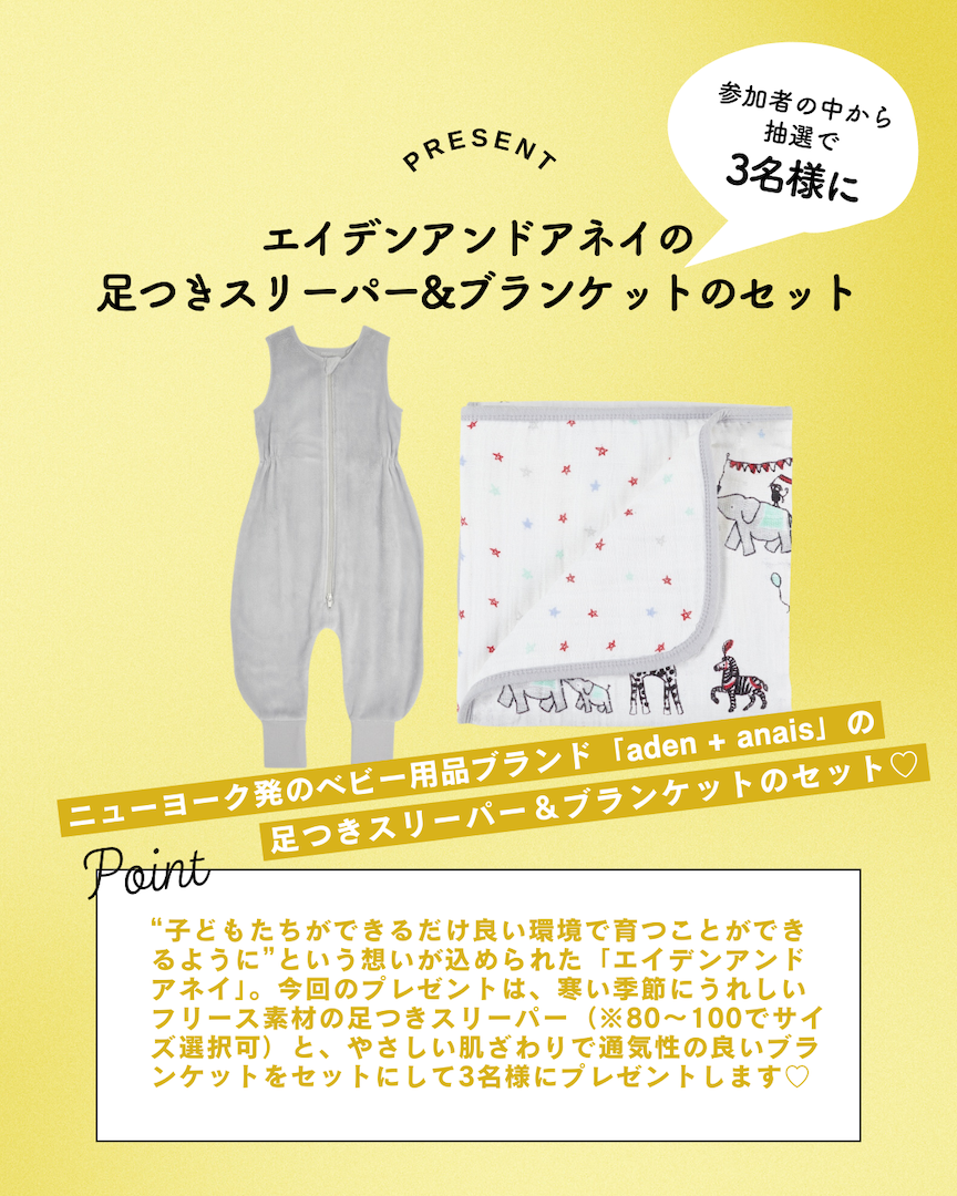 今回参加していただいた方の中から抽選で、豪華プレゼントが当たるチャンスも。ニューヨーク発のベビー用品ブランド「エイデンアンドアネイ」の足つきスリーパーとブランケットのセットを3名様にプレゼントいたします。ぜひこの機会をお見逃しなく♡
