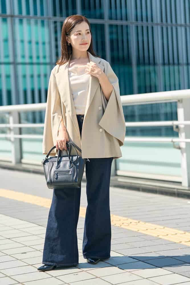 少しルーズなボーイフレンドデニムはマニッシュ感が強いので、女性らしいドット柄のシアーブラウスを合わせました。重見えしないオフホワイトのジャケットを肩掛けして大人っぽい雰囲気を演出し、こなれ感を意識した着こなし。