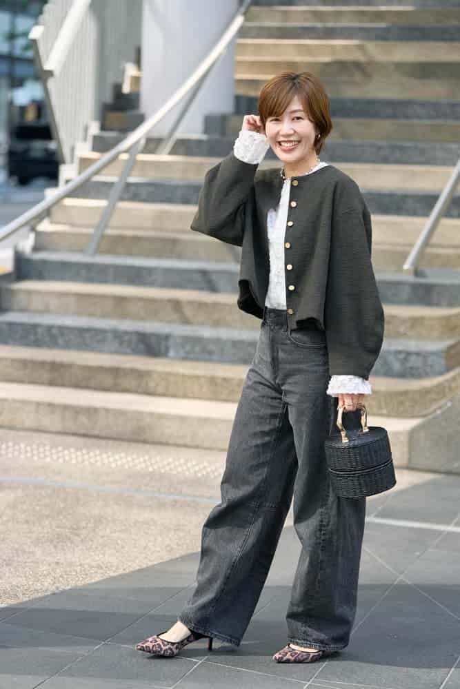 ハードになりがちな黒デニムには甘めのブラウスを合わせ、短丈ジャケットで脚長効果を意識しました。GUのバレルレッグジーンズは柔らかく腰まわりをカバーしてくれるので愛用しています。