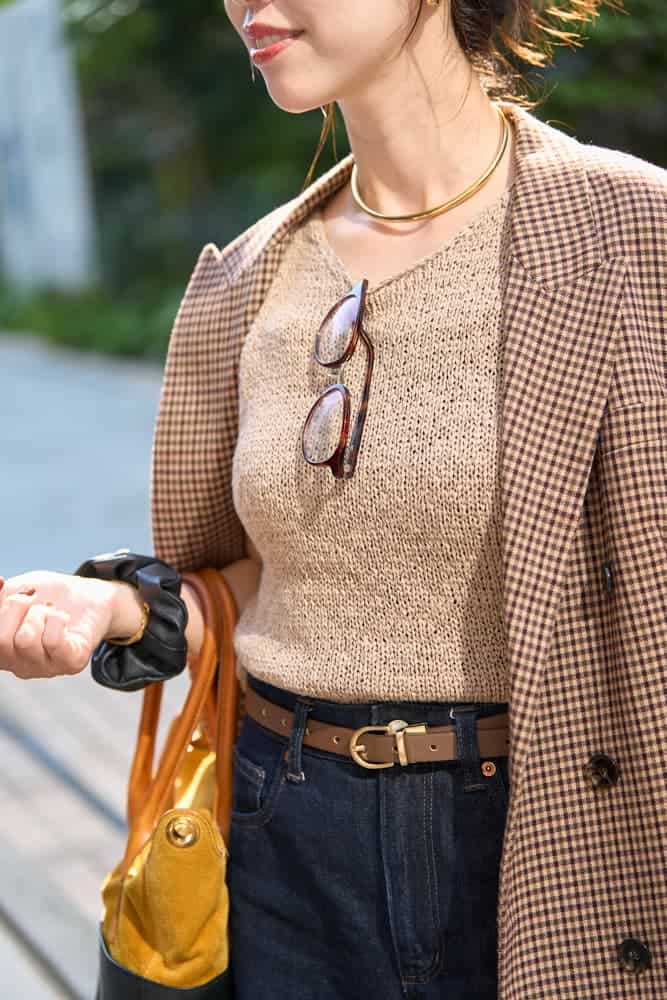 カーブシルエットが足首をキュッと引き締め、足長効果を期待できるバレルレッグジーンズ。ゆとりがあるので動きやすく、やんちゃ盛りの2歳の娘と遊ぶ時にも大活躍しています。今回はピンヒールのパンプスを合わせてきれいめにまとめました。トラッド感溢れるテーラードジャケットとリネンニットのトップスは、トレンドカラーのブラウンで統一。スエード素材のバッグを合わせれば季節感も◎。