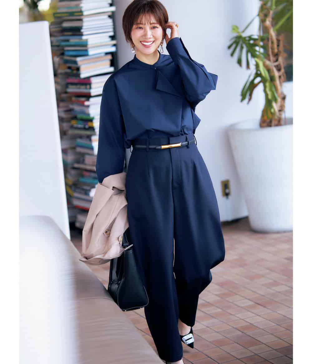 パンツ¥36,300(ロエフ/エイチ ビューティー&ユース)ブラウス¥27,500(hLM/ヒューエルミュージアム 表参道ヒルズ)コート¥66,000(ニコラ ジェンソン/リノウン)バッグ¥26,400〈アンドミューク〉靴¥97,900〈ペリーコ〉ベルト¥22,000(参考価格)〈アトリエアンボワーズ〉(すべてアマン)ピアス¥16,500(ダブルスタンダードクロージング/フィルム)リング¥51,810(参考価格)(オーガスト)