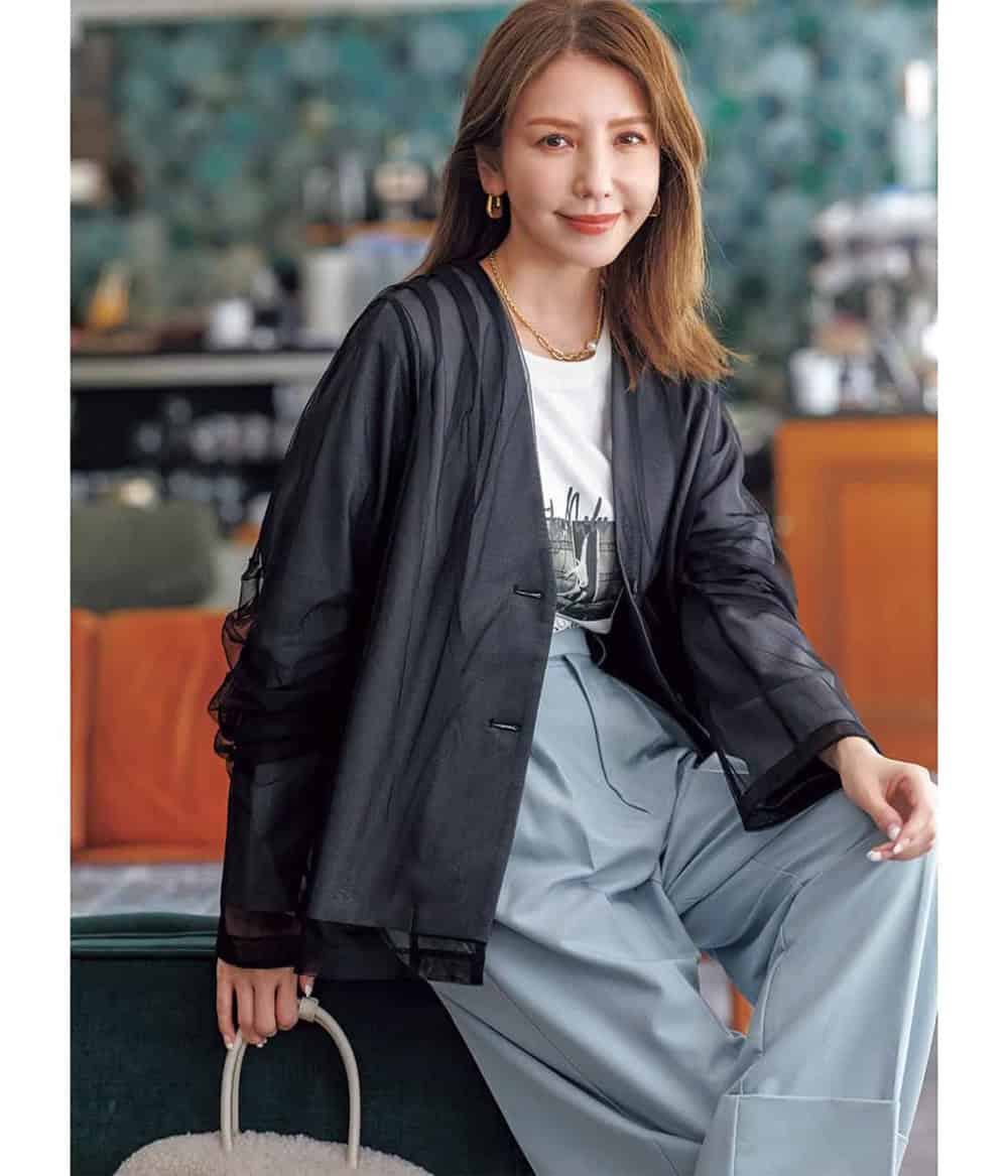 チュールジャケット¥20,900(シークレット・トロフィー)ロゴTシャツ¥9,790(アルページュストーリー)パンツ¥23,100(マイ ストラーダ)バッグ¥14,300(ツル バイ マリコ オイカワ)ピアス¥4,290(ieLS/ロードス)ネックレス¥30,800(ココシュニックオンキッチュ/ココシュニック)