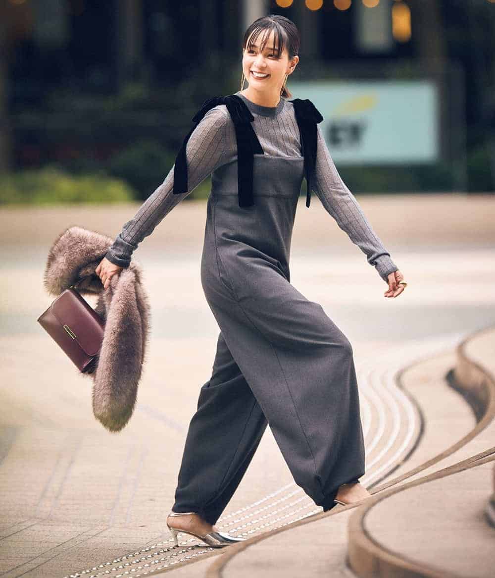 オールインワン¥36,000(シーニュ)ニット¥9,900(ノーク)バッグ¥16,500(アンタイトル)パンプス¥66,000(ネブローニ)ストール¥14,300(マルティニーク/マルティニーク ルミネ横浜)ピアス¥19,250(マユコ)リング¥24,200(ココシュニック オンキッチュ/ココシュニック)