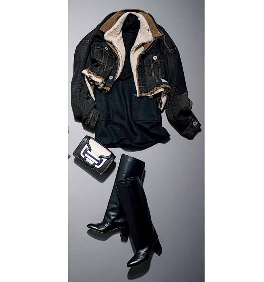 レイヤード見えするデニムアウターのインパクトに一目惚れ! キレイめなほぼクロコーデに羽織れば、きちんと感と遊び心が両立できて年末のパーティーでも重宝しそう。