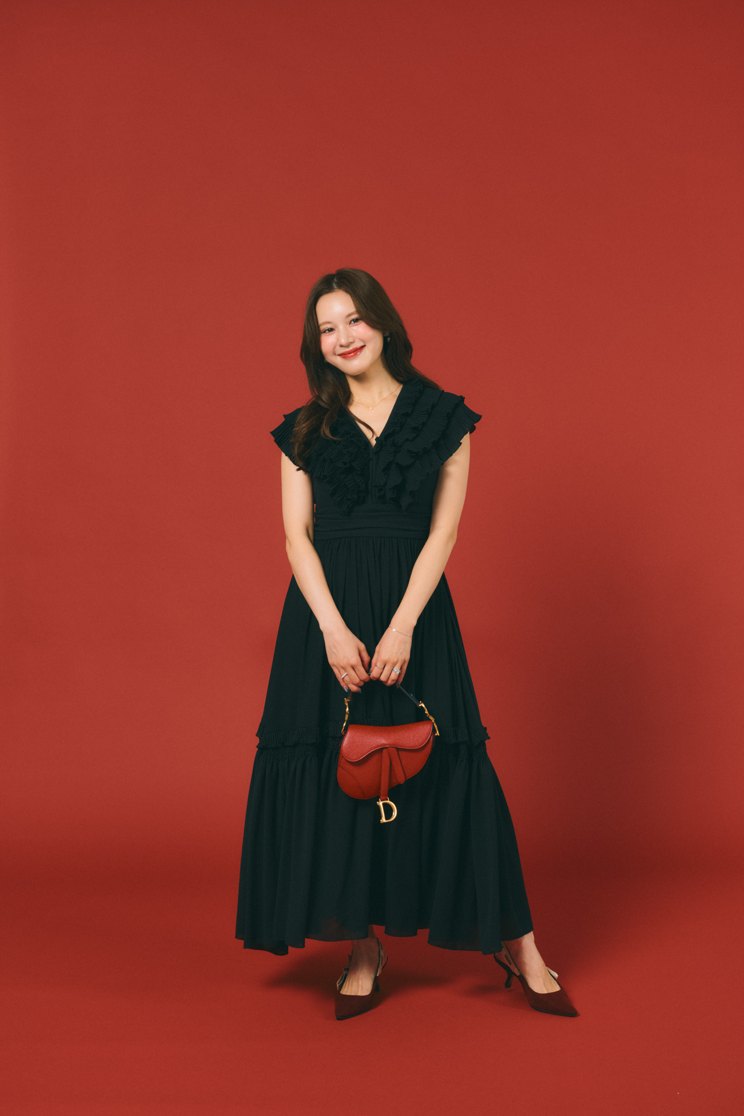 「黒ワンピって重たく見えがちですが、素材感で軽さを出すのがこだわりポイントです。シフォンの揺れ感がキレイなローブブランのワンピースに、ディオールの小物を合わせて華やかさをプラス。きちんと感を出したい日や、ホテルランチなどちょっと特別なシーンにも対応できる万能な黒コーデです」