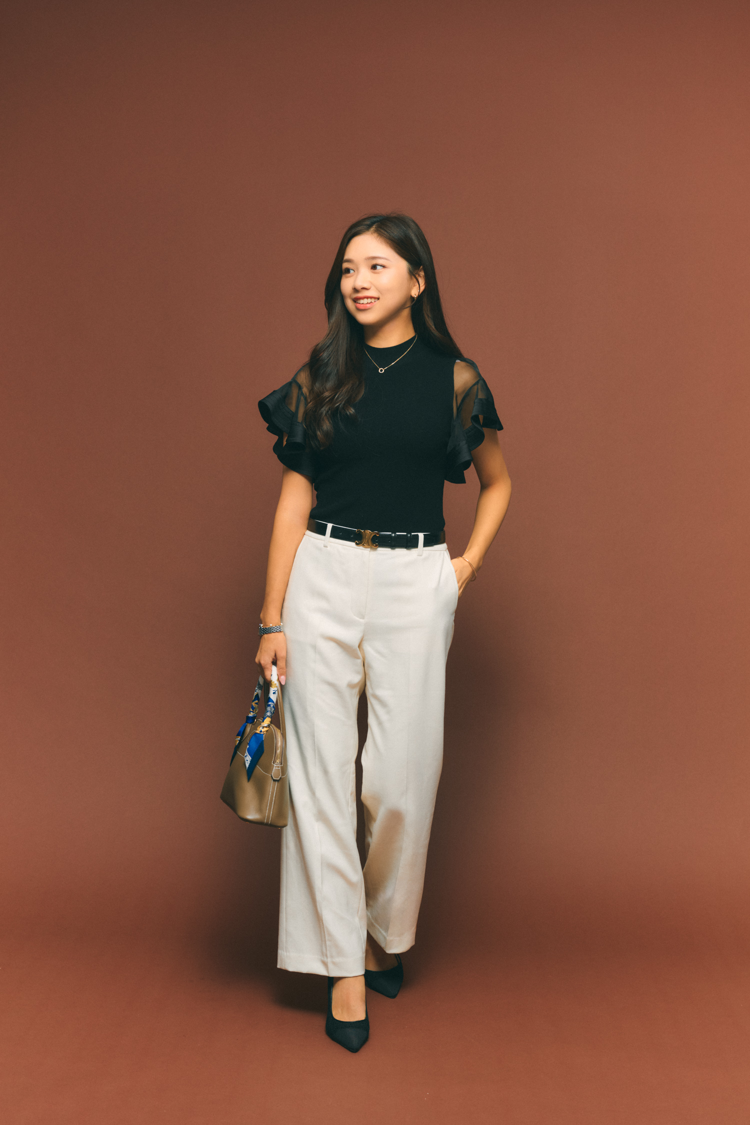 「出社の日はモノトーンでまとめることが多く、室内の暖房が効いているので半袖で過ごす日も。フレイ アイディーのブラウスはジャケットを羽織るだけできちんと見えする便利な一枚。袖がシースルーなので着映えます。ボトムスはプラステのワイドパンツを合わせました。ジュエリーや小物で、シンプルなコーデに華やかさをプラスするようにしています」