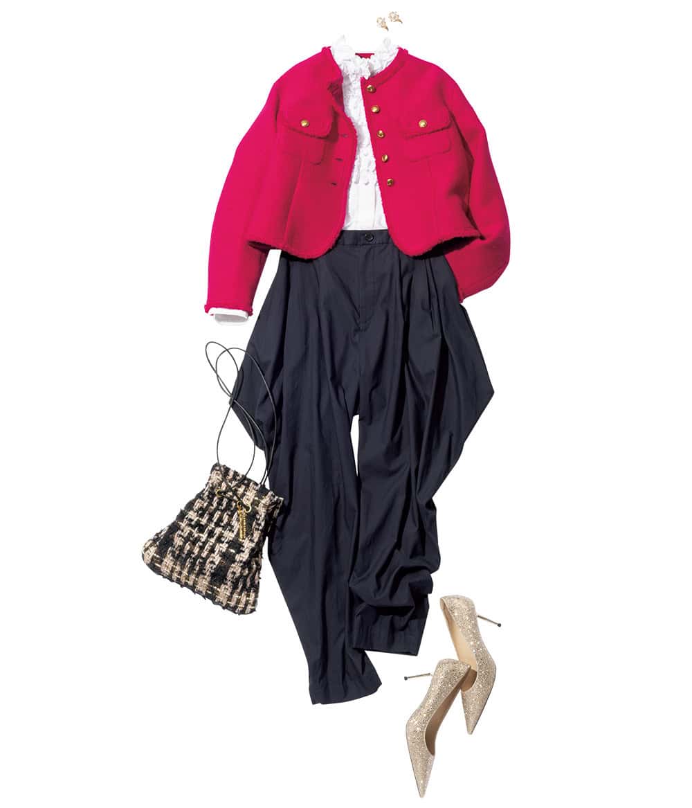 パンツ¥37,400(カレンソロジー/カレンソロジー二子玉川)ジャケット¥52,800ブラウス¥33,000(ともにトゥモローランド コレクション/トゥモローランド)バッグ¥18,700(シャルマントサック)シューズ¥27,940(STACCATO/バロックジャパンリミテッド)ピアス¥42,900(ジャスティン デイビス/ジャック・オブ・オール・トレーズ プレスルーム)