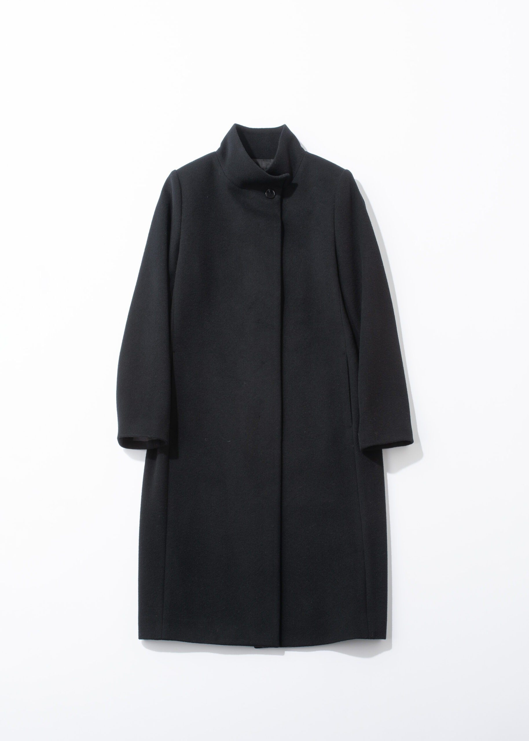 すっきりとしたIラインシルエットに加え、抜け感はありつつ、クラシックできちんと感も感じさせるスタンド衿デザインのロングコート。ゆとりあるサイズ感なのも嬉しいポイント。スタンドカラーコート¥51,700(インディヴィ/ワールド プレスインフォメーション)