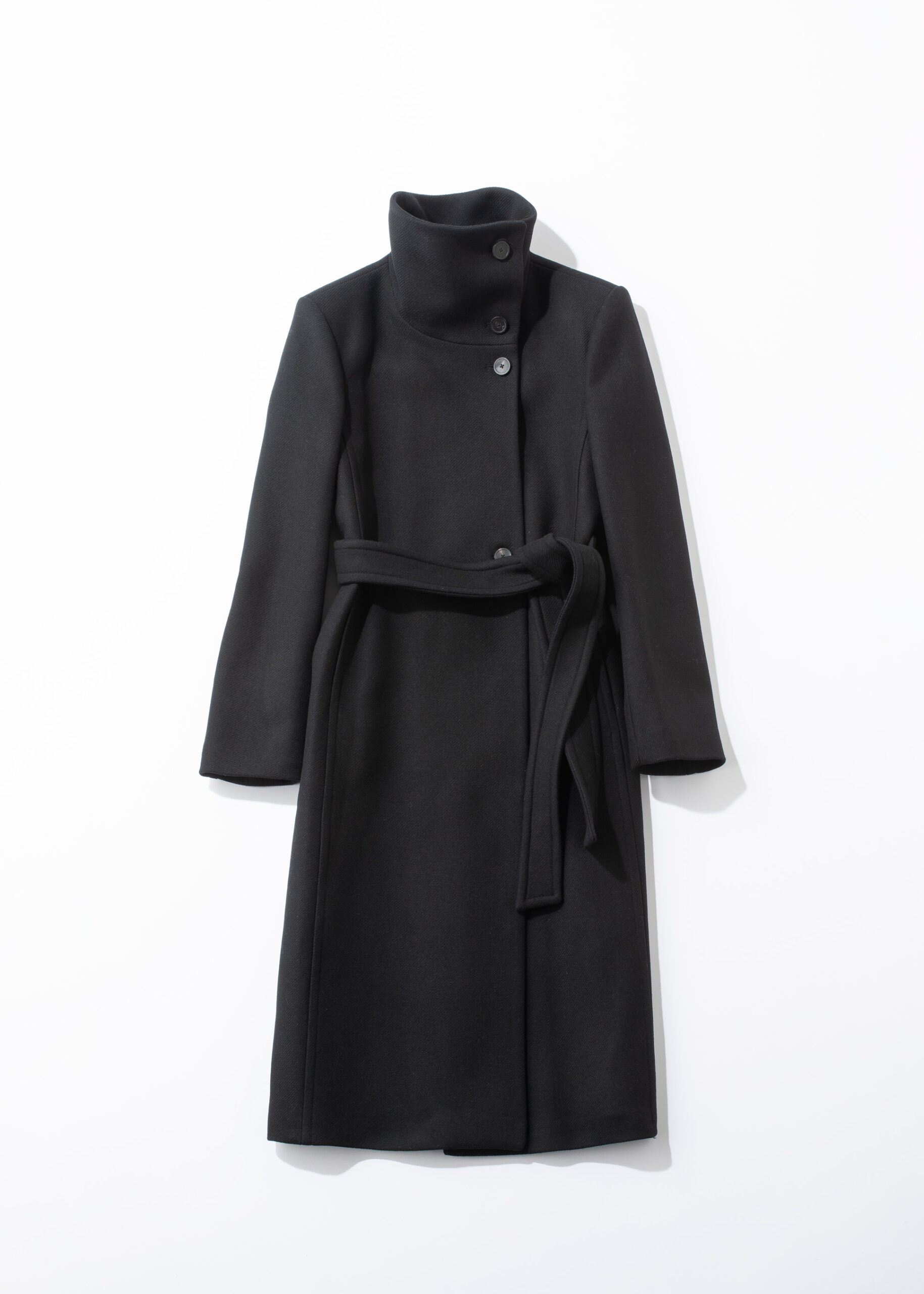 ストレートシルエットのロング丈で、首元はボタンの留め方次第でスタンド衿にもすることが可能なハンサムデザイン。シンプルながらも品のある雰囲気で周りと差がつく黒コートです。スタンドカラーベルテッドコート¥34,900(MANGO)