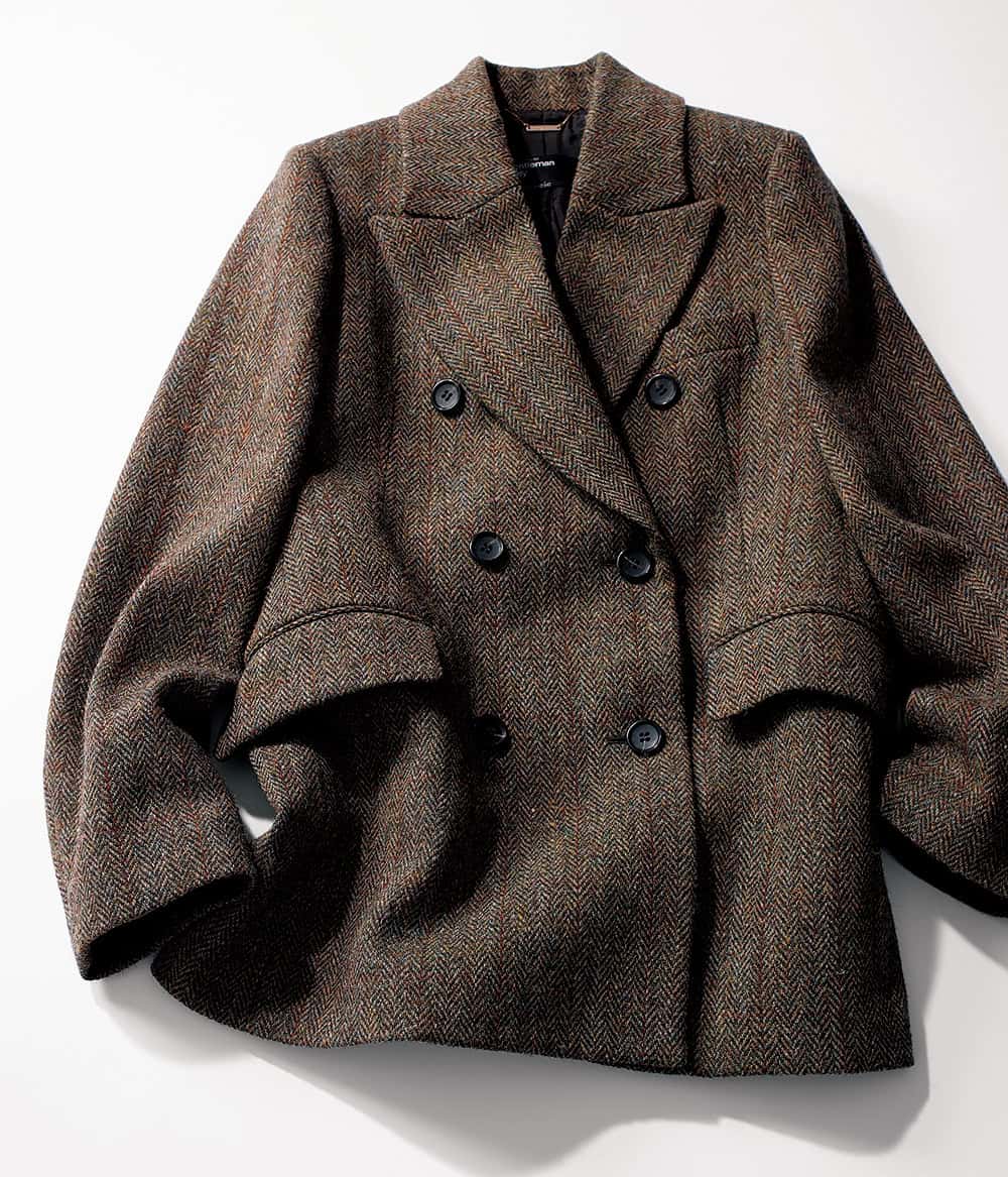 伝統あるハリスツイード生地、メンズ仕立てにこだわったデザインは羽織ると体のラインをしなやかに見せ、エレガントなムードが引き立つ一着と評判。