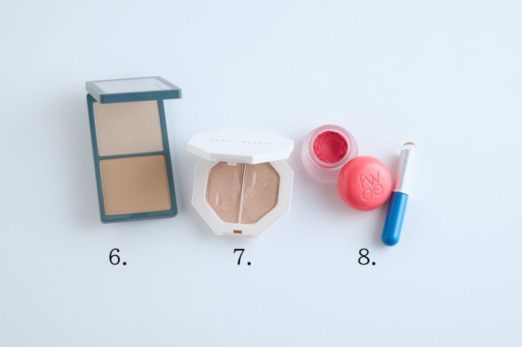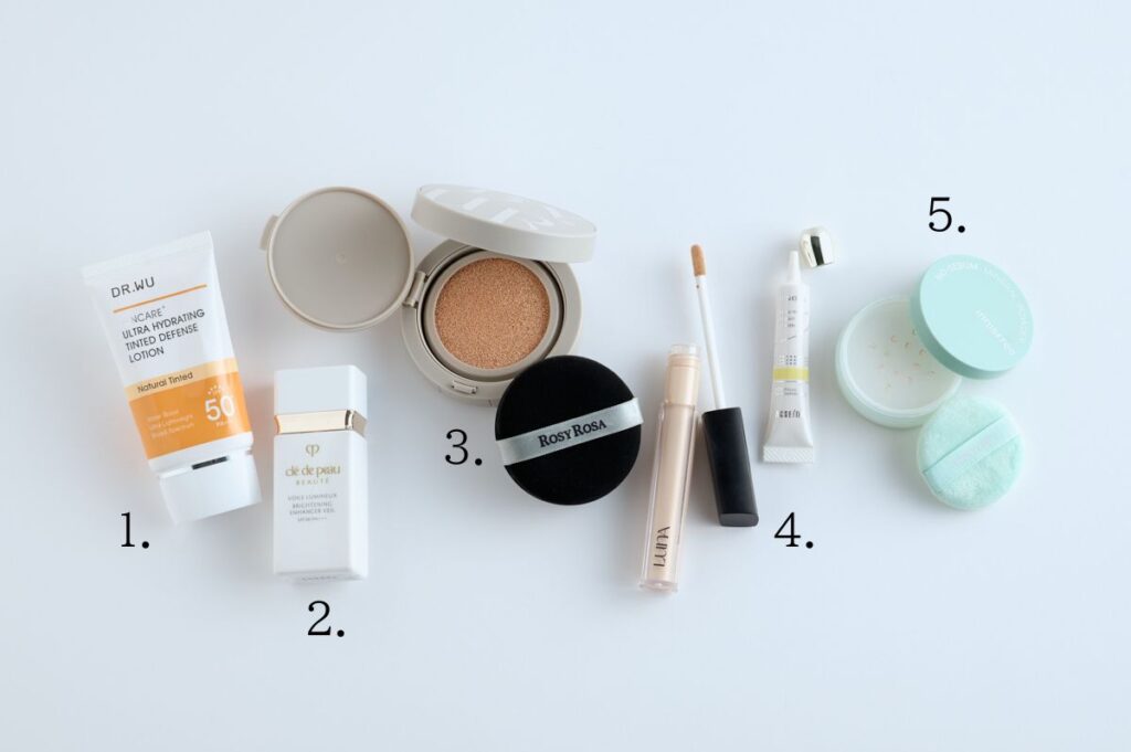 1~3.これからの季節、最も重要な日焼け止めは敏感肌でも使える「DR.WU ウルトラ ハイドレーティング ティンティッド ディフェンス ローションSPF50+・PA+++」をチョイス。さらにトーンアップさせるために下地は「クレ・ド・ポー ボーテ ヴォアールルミヌ 美白プレメイクアップ SPF38・PA+++」を重ねて使います。これがとてもナチュラルにお肌を白くしてくれる優れもの。ファンデーションは「BYUR セラムフィット シルキー ヌードクッション #17フェア」を付属のパフではなく「ROSY ROSA マルチファンデパフ」でのせていきます。このパフはヘアメイクさんに教えてもらったのですが、ファンデーションをパフが吸収してしまうことなく、きれいに肌にフィットさせてくれるのでめちゃくちゃ気に入っています。肌当たりもすごく柔らかいので摩擦の心配も無用♪ パフって大事ですね。