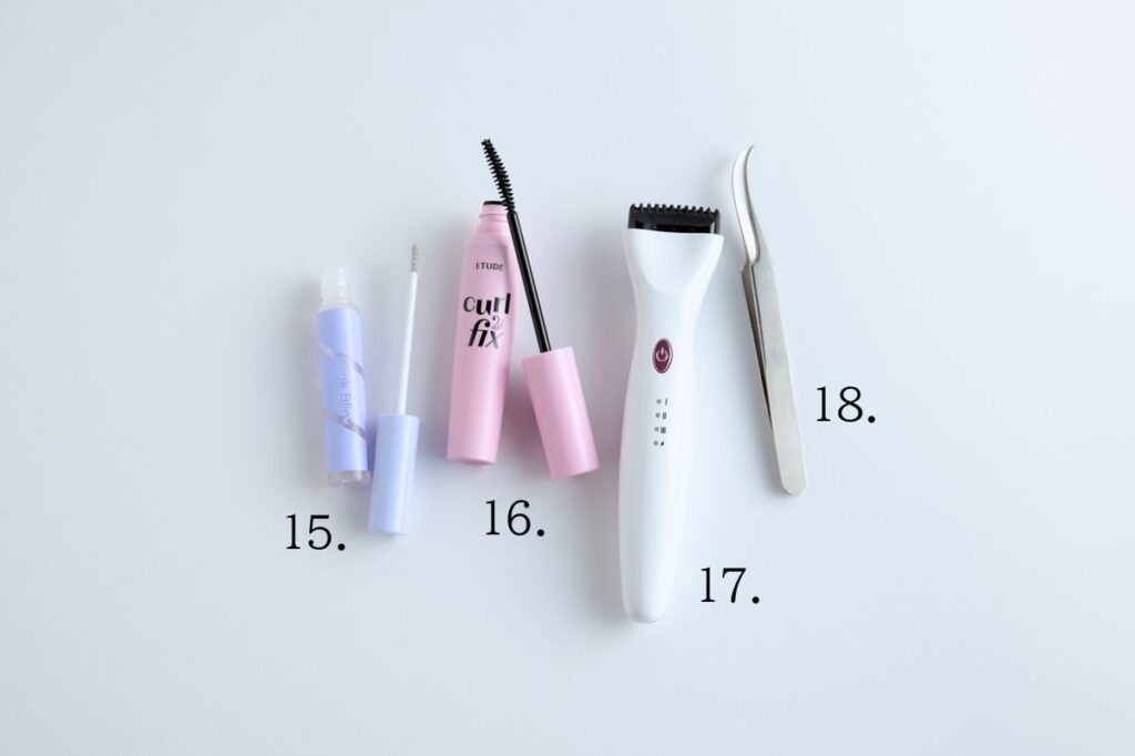 15~18.透明の「ブリンクブリンク 束感トップコート」でまつ毛の土台をつくります。そこに「ETUDE カールフィックスマスカラ ブラック」のマスカラを使用。そしてホットビューラーを使って全体的にまつ毛を上げていきます。そのときに「ピンセット」を使って整え、まつ毛の束感を演出していきます。