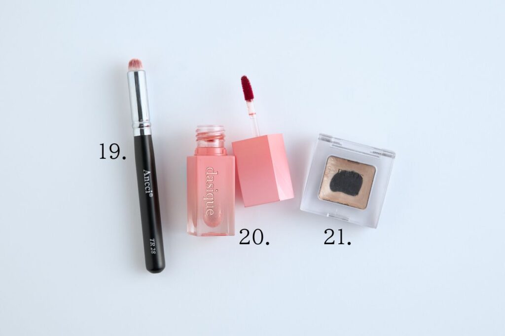 19~21.リップブラシ「Ancci アンシブラシ TR28」を使って「Dasique ジューシーデュイティント # 20 ベアーヌード」を唇に塗ります。このブラシが優秀で、絶妙なトーンに上手にぼかせて、かわいく塗ることができますよ。私は唇が薄めなので、これを使って上唇をオーバーめに描くようにしています。最後に唇のてっぺんにハイライトで「ETVOS ミネラルアイバーム #シャンパンアイボリー」をちょこっとのせます。リップをオーバーめにしてハイライトでてっぺんをぷっくりさせることで人中を短く見せたい! いかにナチュラルに溝に色を入れるかを心がけています。まだ試行錯誤中ではありますが(笑)