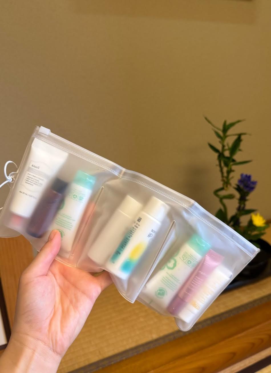 1〜2泊の旅行の時はSeria(セリア)の仕分けポーチが大活躍! パウチ状のサンプルだけでなく、チューブタイプも収納できるのが使いやすく、常備しています。濡れても平気なビニール素材なので、温泉などにも持ち込めて、ストレスなく美容を楽しめます。セリアパトロールは定期的に行っていて、常に何かいいものないかな?と色々試しています。