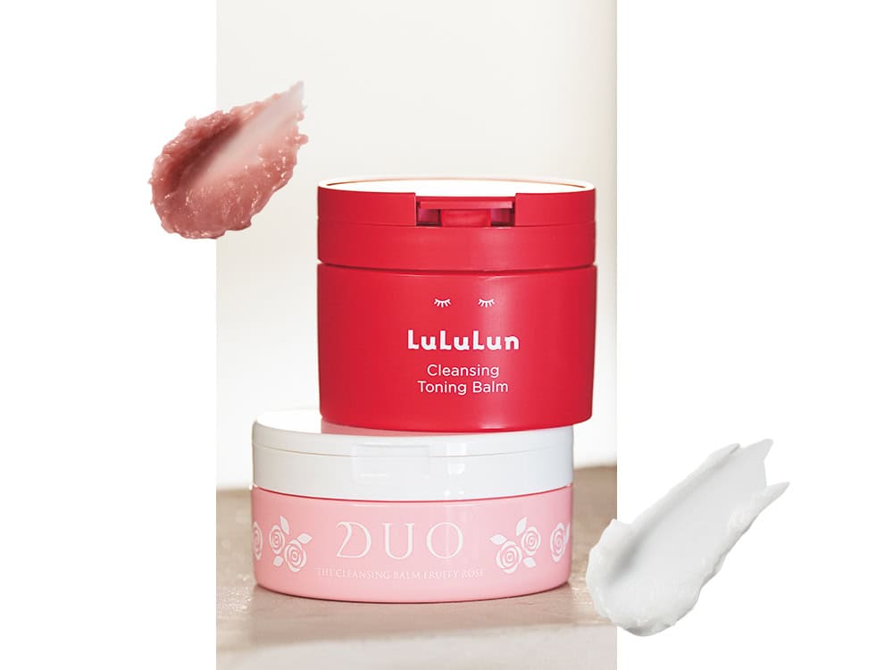 <下>乾燥やハリ不足をほぐす。デュオ ザ クレンジングバーム フルーティーローズの香り 90g ¥3,960【数量限定】(DUO)、<上>泥とW酵素で!ルルルンクレンジング トーニングバーム SMOOTH RED 90g ¥2,420(Dr.ルルルン)