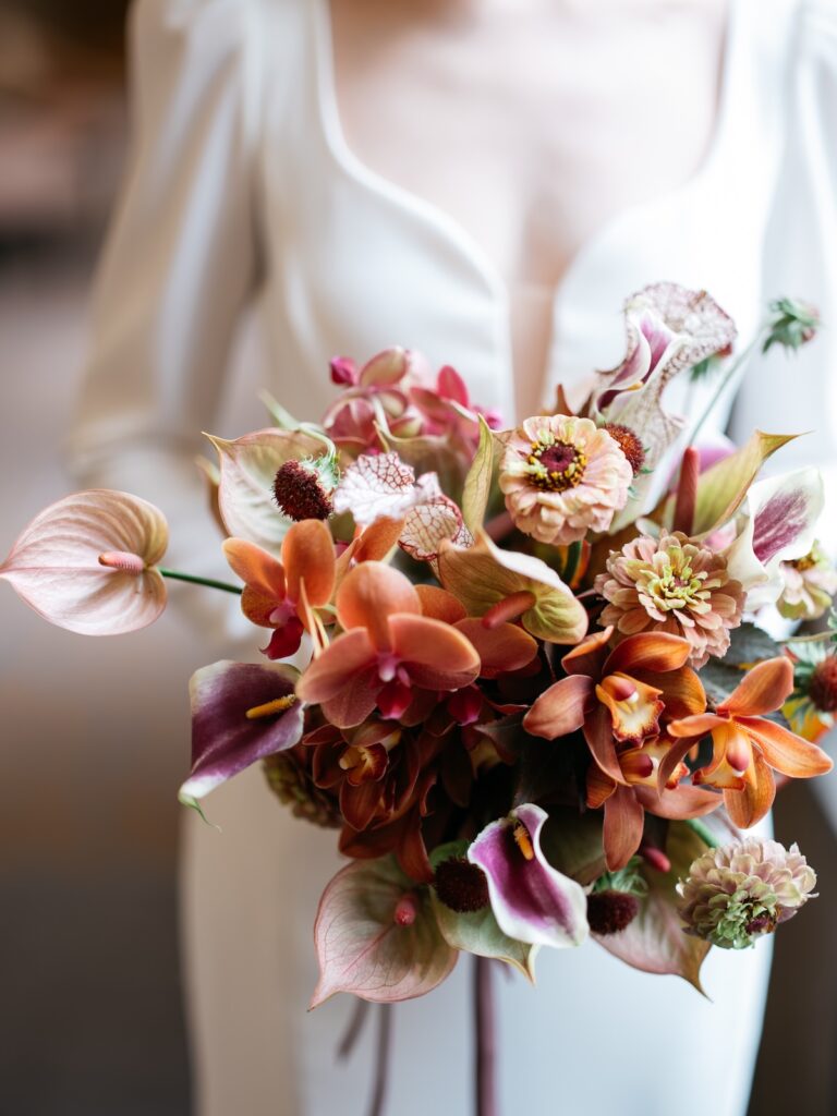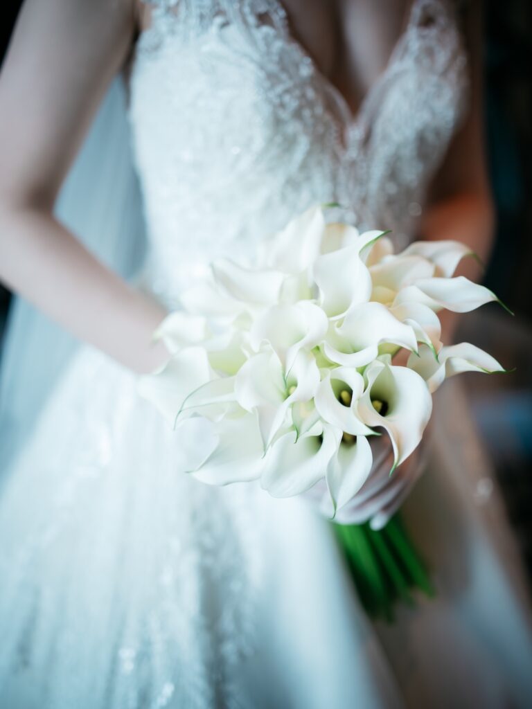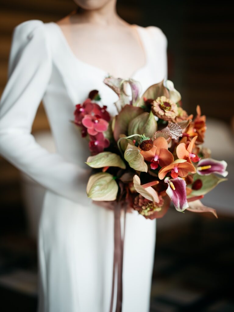 ブーケは挙式ではホワイトカラー、披露宴では胡蝶蘭、アマランサス、そして深みのある赤紫の小花。