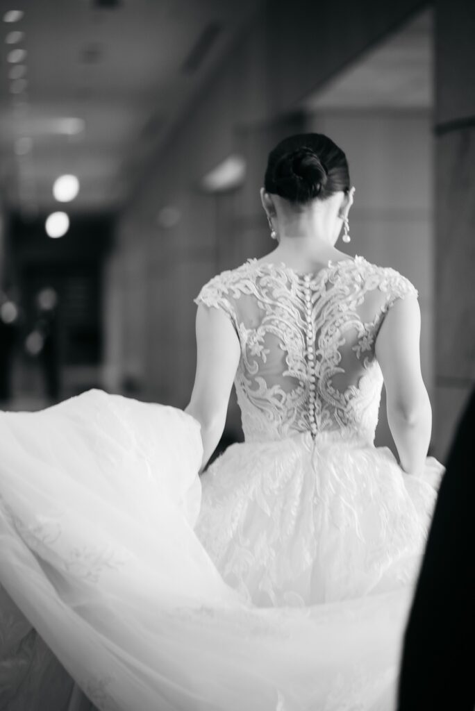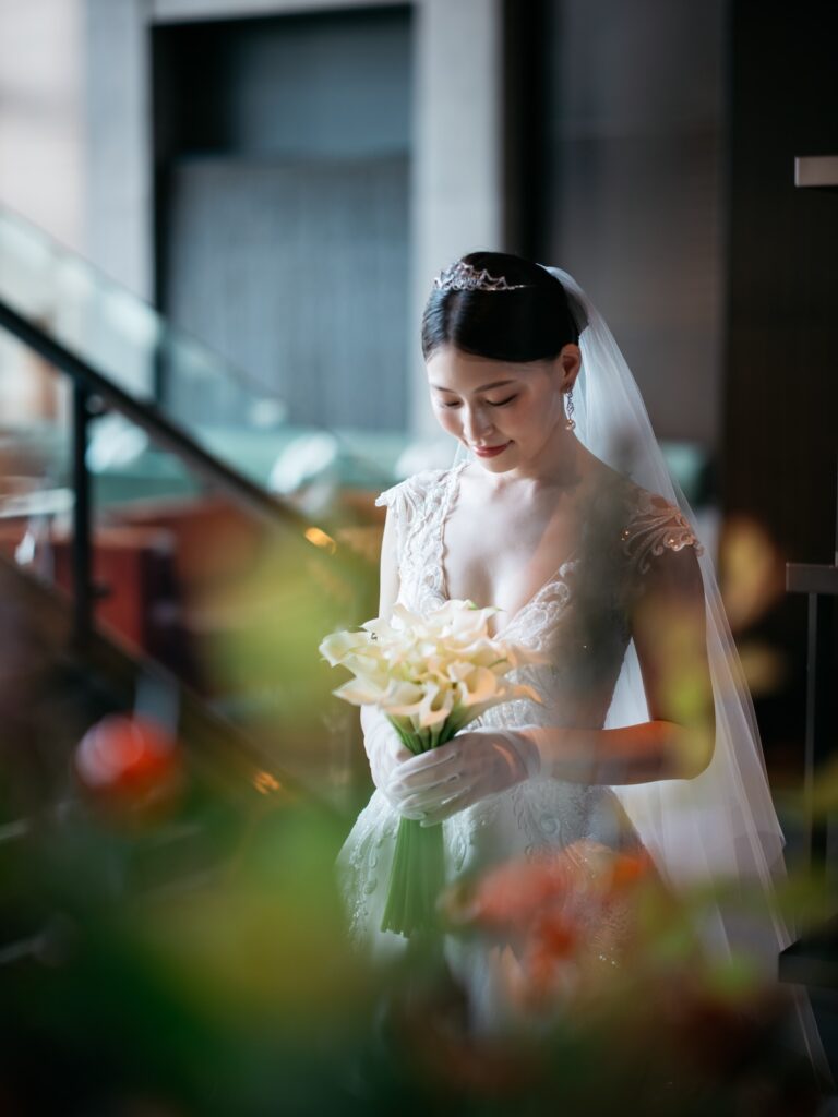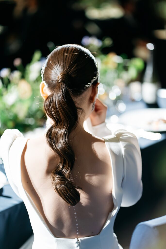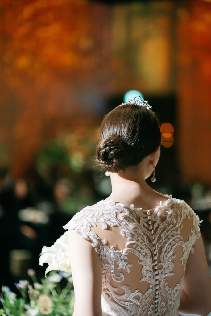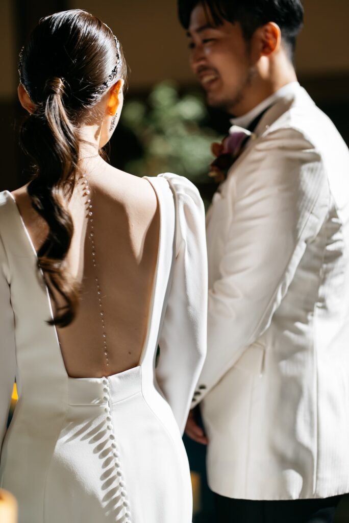 ドレスは二着とも「PRONOVIAS(プロノビアス)」。一着目に選んだドレスは、凛として洗練された佇まいながら、前後で異なる表情を見せるデザインに惹かれたそう。