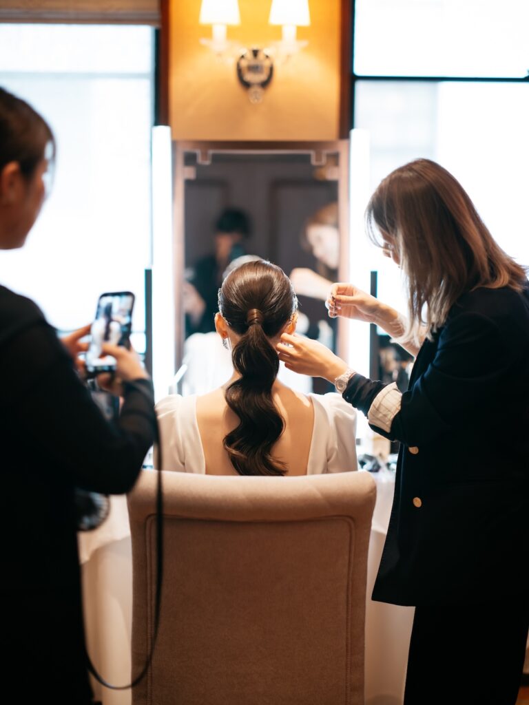 ヘアメークは、大阪のドレスブランドの前撮り企画で出会ったブライダルヘアメイクアーティストの竹本実加さん。