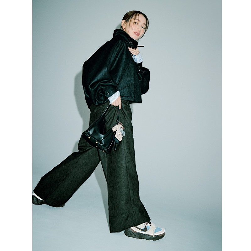 スニーカー/舞ちゃん私物 シャツ¥35,200(オペラスポーツ/サードマガジン)ジャケット¥75,900(ザ・リラクス)パンツ※別注¥49,500(ザ・リラクス/エディション 表参道ヒルズ店)ピアス¥24,200(ジュエッテ)バッグ¥126,500(アドヴェン/トゥモローランド)バッグに付けたチャーム¥4,950(アメリカーナ フォー サロン/サロン アダム エ ロペ)