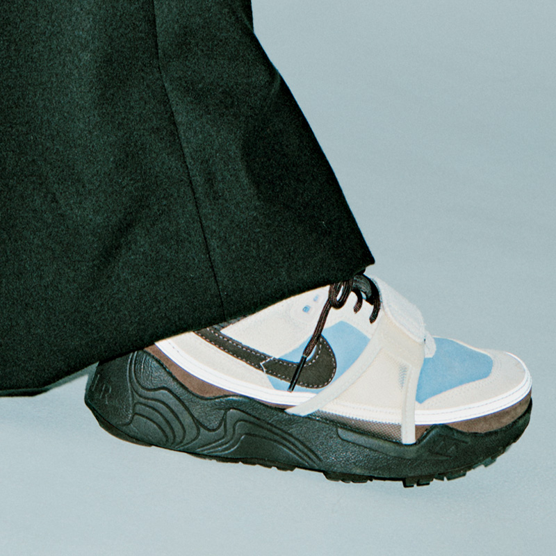 スニーカーツウ、夫のよしさんのオススメで抽選購入したNIKEは、トラヴィス・スコットとのコラボ。メンズっぽいムードで清潔感のある水色がシンプルモードにマッチ、使いやすい!