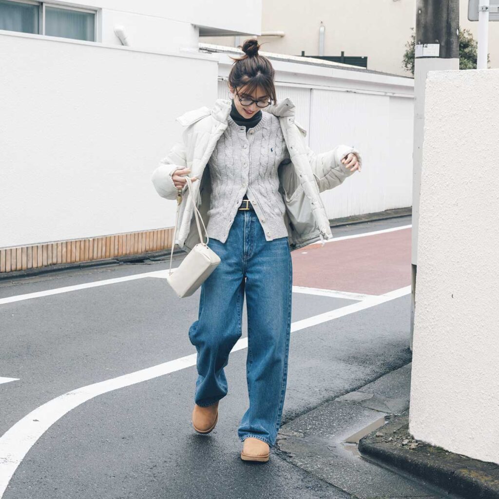 人混みや待ち時間で冷えがちな初詣は、寒さ対策も見映えも抜かりなく。ラフになりがちなデニムも、淡い色のダウン×カーデで揃えれば清潔感のある冬コーデに導けます。お団子ヘアにメガネを合わせた、抜け感と知的さのバランスが絶妙。