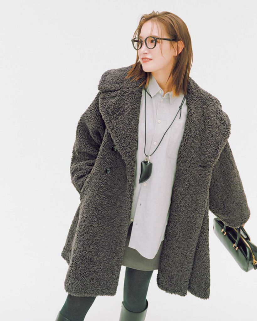 年末年始の帰省では、動きやすさをキープしつつ好印象も狙いたいところ。着膨れが気になるボアコートは、シャツでキリッと、ミニスカ×ブーツですっきりまとめるのが正解です。グレータイツを合わせれば、大人っぽさを引き立てながら防寒対策もばっちり。