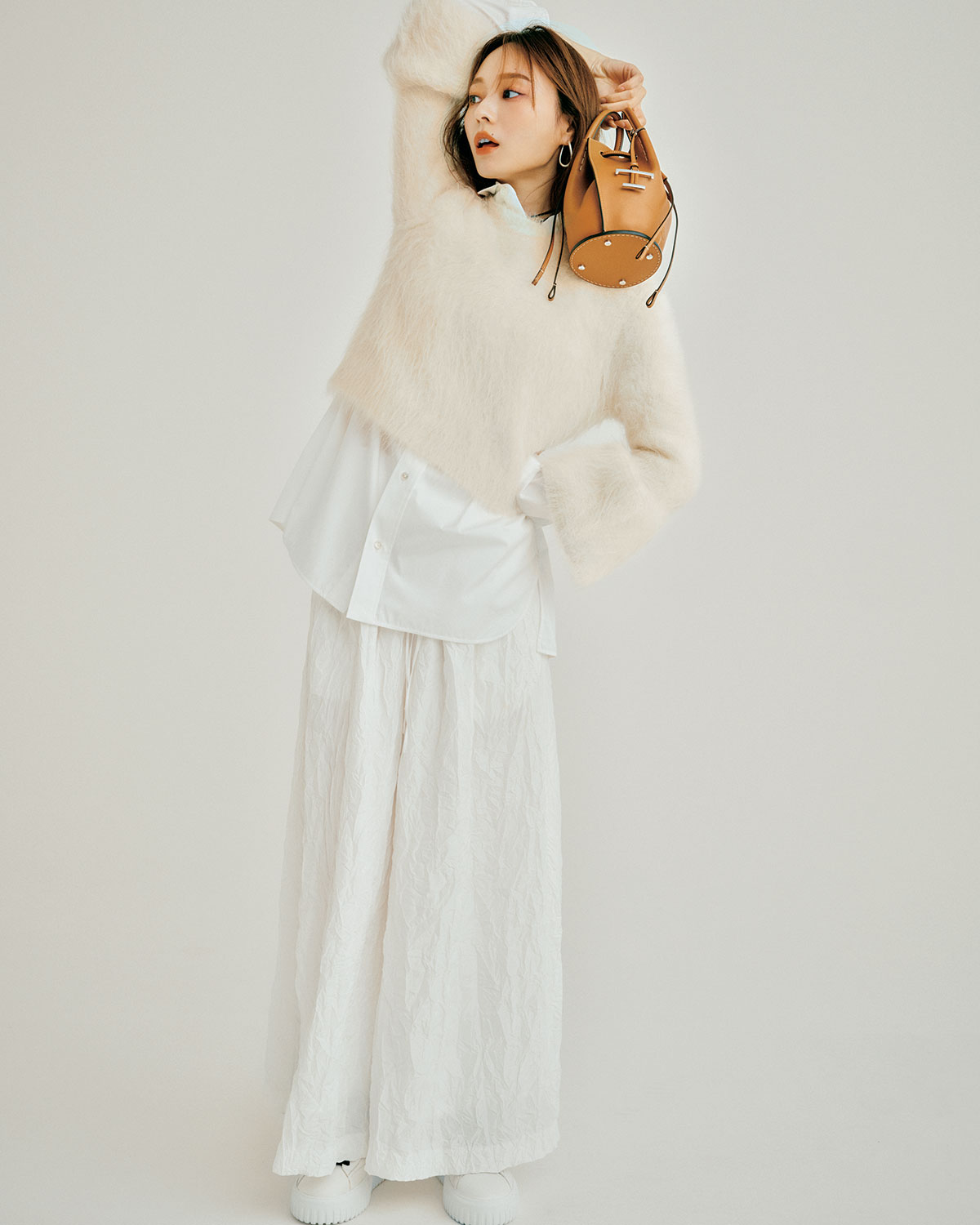 ダークトーンを纏いがちな冬こそ、白が持つ繊細で可愛げのあるムードを味方にして。異素材の白を重ねることで、シンプルなのに奥行きのある印象に。軽やかに揺れる素材感が、冬のデートにちょうどいい自然体のムードをつくります。ブラウンバッグでコーデ全体をやさしく引き締めて。