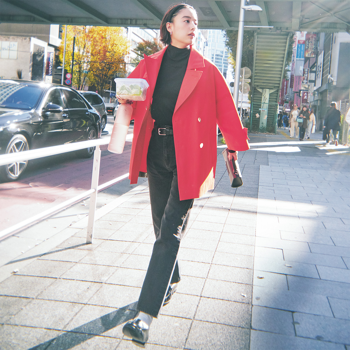 モノトーン派こそ試してほしい、ドラマティックな赤コート。黒のタートル×デニムの上なら派手になりすぎず、旬のトラッドムードが漂います。ほどよい鮮やかさが顔映りを明るくし、年末年始ならではの高揚感にもマッチ。