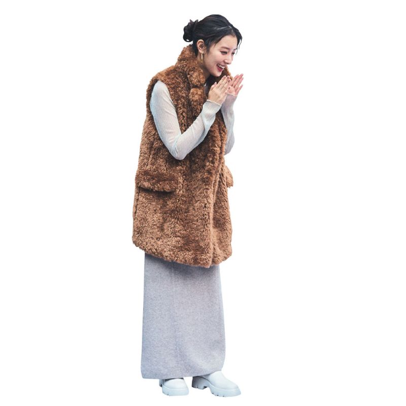 ふわっと包み込むようなブラウンのボアベストは、おうちパーティでも浮かない上品なカジュアルさが魅力。インナーは透け感のあるトップスを合わせて、ほどよい抜けを意識して。白ブーツで軽さを添えれば、親しい仲間との時間を心地よく過ごせるリラックススタイルが完成です。