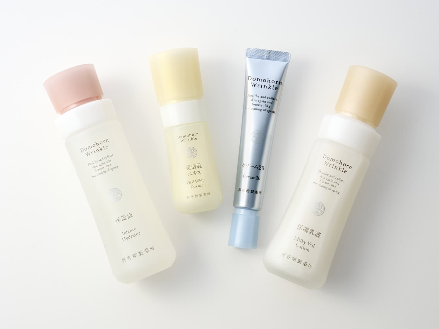 (左から)保湿液 120mL ¥5,500[約60日分]、美活肌エキス【医薬部外品】30mL ¥11,000[約60日分]、クリーム20【医薬部外品】30g ¥14,300[約60日分]、保護乳液 100mL ¥5,500[約70日分]/再春館製薬所