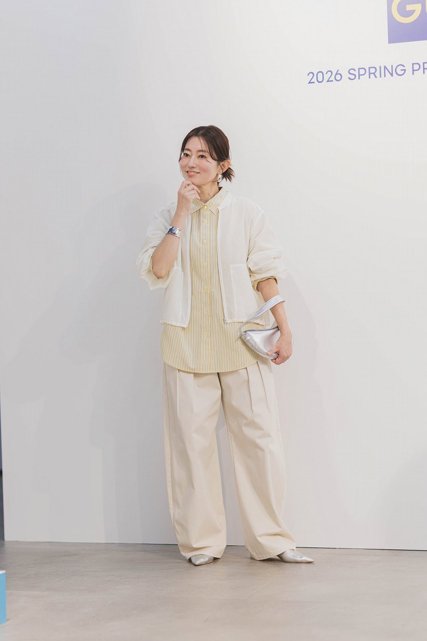 「春を意識して今からすぐ取り入れたいのが、ストライプのイエローシャツ。肩周りにゆとりのあるドルマンスリーブなのでリラクシーな雰囲気に。まだ寒い時期は、ニットを上から着てシャツを覗かせれば、こなれ感のある装いに。ビッグシルエットなので、春はボタンを開けて羽織りとして着ても◎。今回はシアーなブルゾンと合わせて全体をイエロー×オフホワイトの淡いトーンでまとめたコーデにしてみました。」