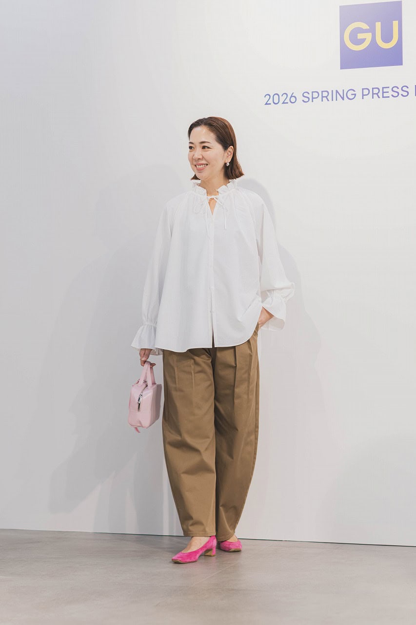 フリルネックチュニック¥2,490 チノバレルレッグタックパンツ¥2,990[2月上旬販売予定](ともにジーユー)※すべてMサイズを着用 靴、バッグ(ともに私物)