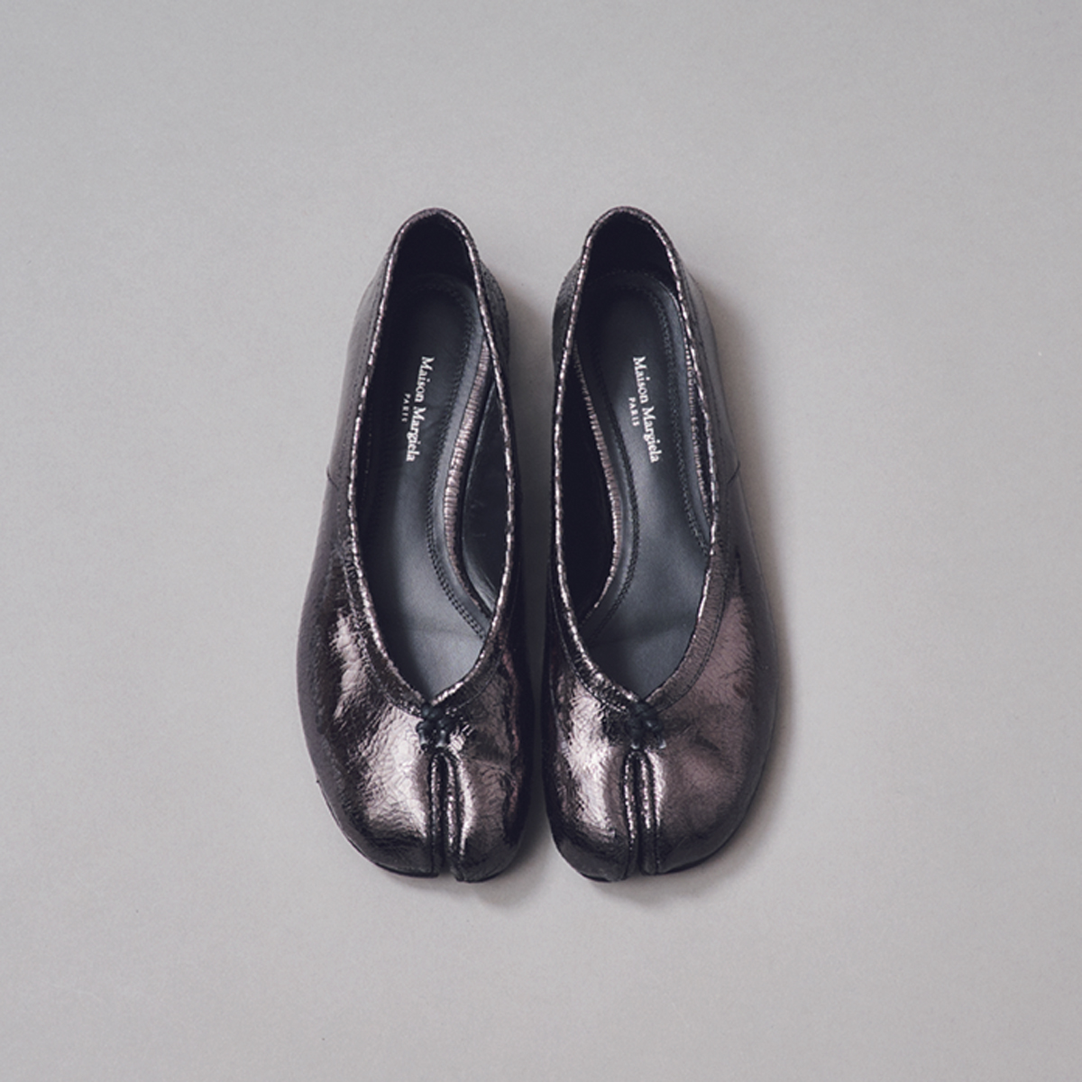 その生地の新鮮さに一目ぼれして即決した、ミラー仕上げのタビ。光によって表情の変わる表面が、どんな服を着ていてもポイントになるし、履いてるだけで周りから可愛い!と褒められる確率高めです。
