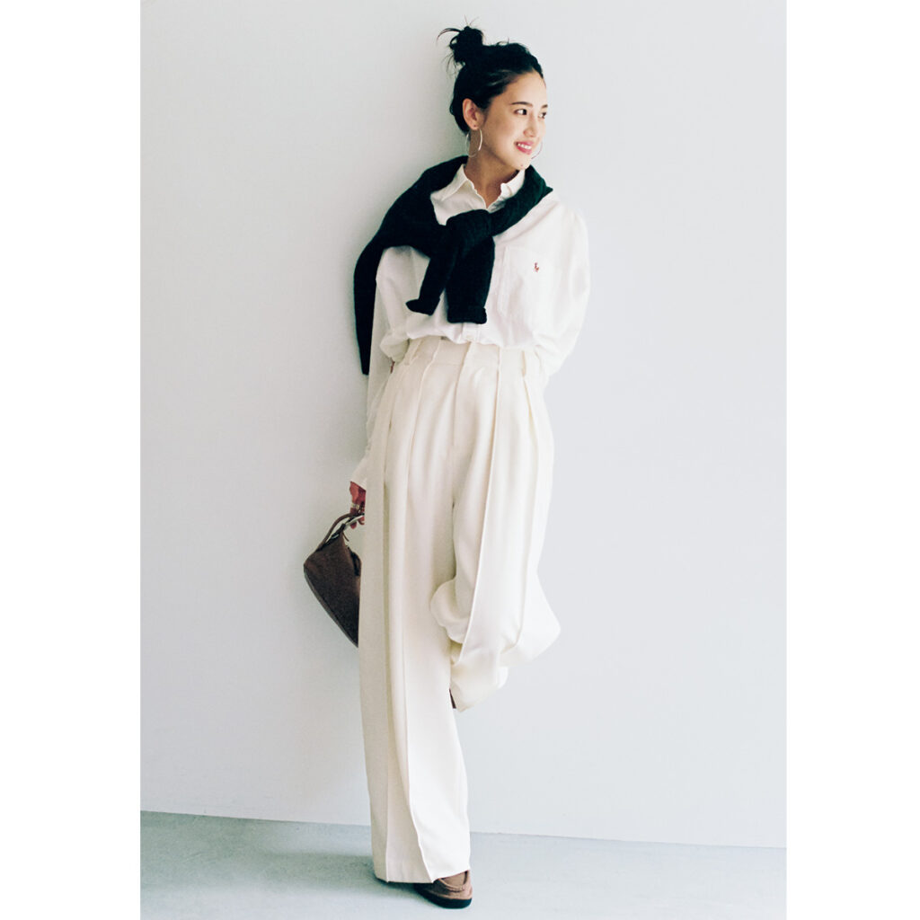 白シャツとワイドパンツは、ほどよいゆとりを残しつつ端正な雰囲気もキープできる、大人にちょうどいい組合せ。肩掛けした黒ニットがかしこまりすぎる印象を和らげ、こなれた空気をひとさじ添えてくれます。品よくまとめながらも力みのないスタイルで、キレイめカジュアルを上手に更新。