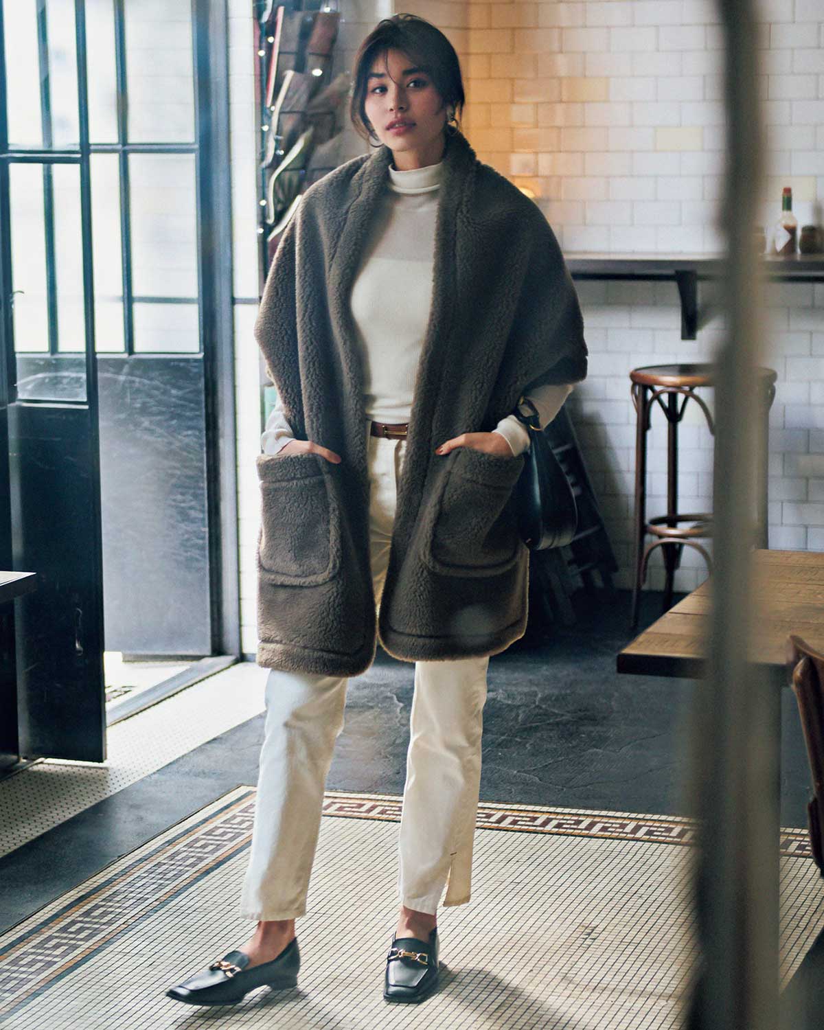 軽やかで透明感のある白は、冬にまとうとクールに傾くことも。そんなときは、ボアストールをそっと重ねるだけで表情がやわらぎ、ほどよい温もりが加わります。白デニムのラフさを軸にしながら、ベルトやローファーで端正なムードを添えている点も上品見えの決め手。