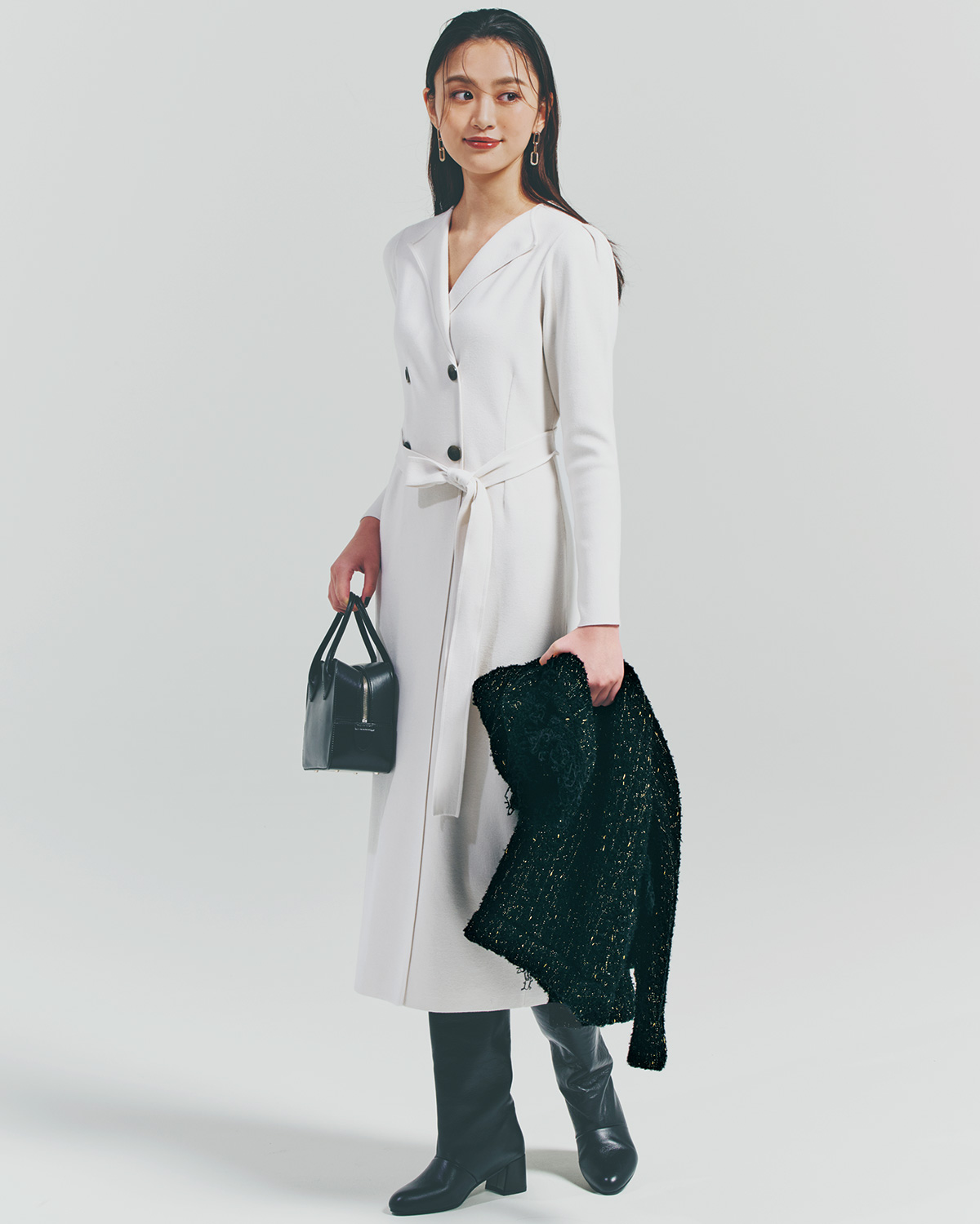 クリーンな印象をもたらしてくれる白ワンピは、冬の装いを品よく仕上げたい日に頼れる存在。トレンチ風の端正なデザインなら、かしこまりたいシーンでも気負わず着られ、会食や出張の場にもぴったりです。黒のバッグやブーツを合わせ、白のやわらかさを残しつつピリッと辛口に引き締めて。