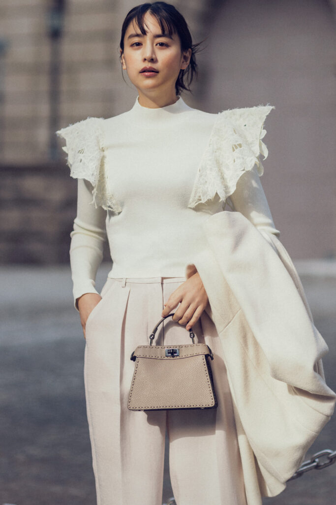白コーデが淡くまとまりすぎてしまうときには、肩のフリルが視線を引き寄せてくれるデザインニットが効果的。優しいトーンの中にアクセントが生まれ、顔まわりまで華やかに。タックパンツでキレイめをキープしつつ、白アウターをさらりと重ねれば明るさが引き立つ白コーデが完成。