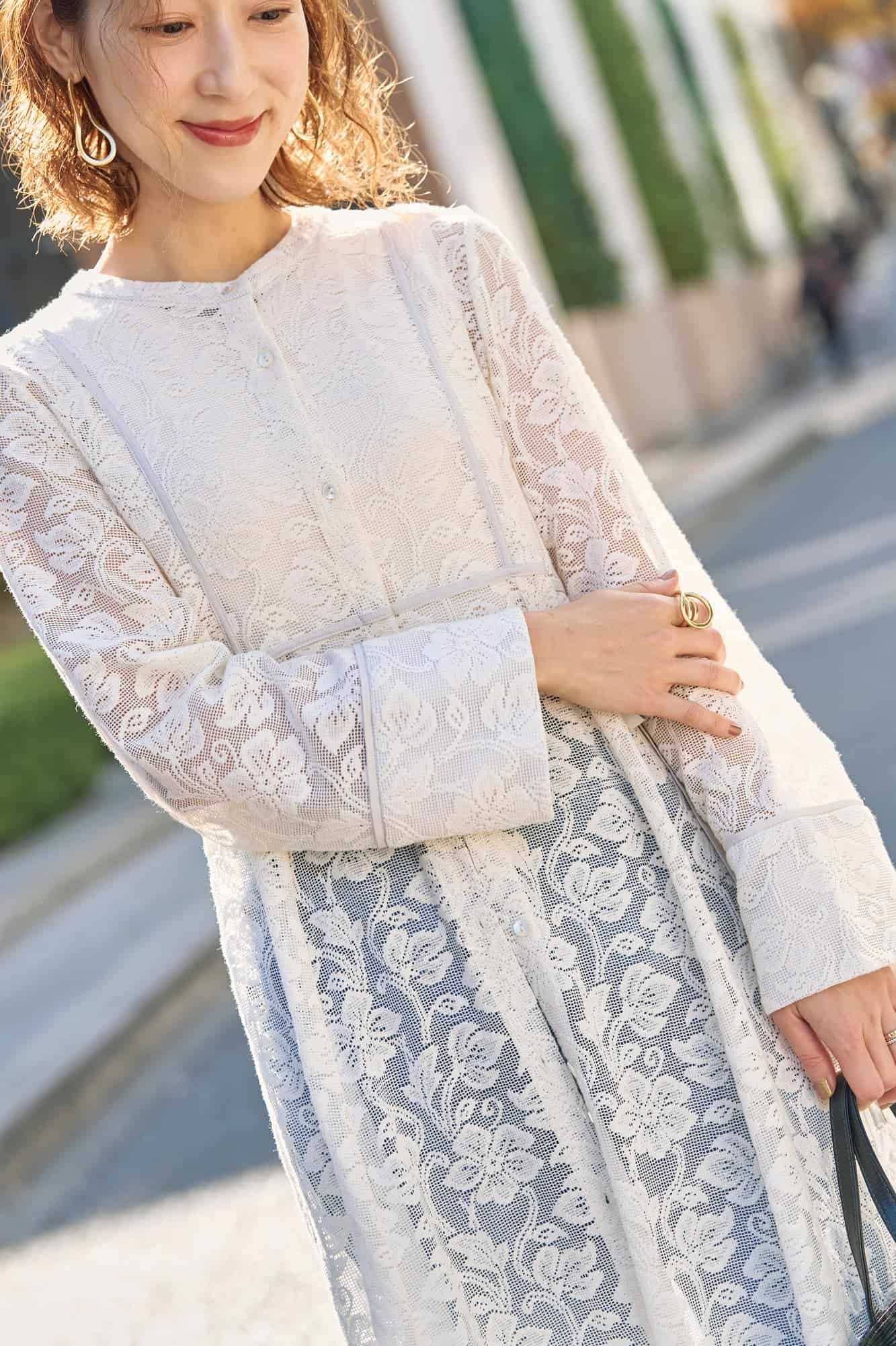 1枚で着るとドレッシーになってしまう白のレースワンピ。デニムと合わせて甘くなり過ぎないようにしました。このワンピースは動くたびに表情が出るので着るだけでコーデに華やかさをプラスしてくれます。季節を問わず着られるのもポイント。冬は同色ロングコートを羽織り、レイヤードスタイルを楽しみます。