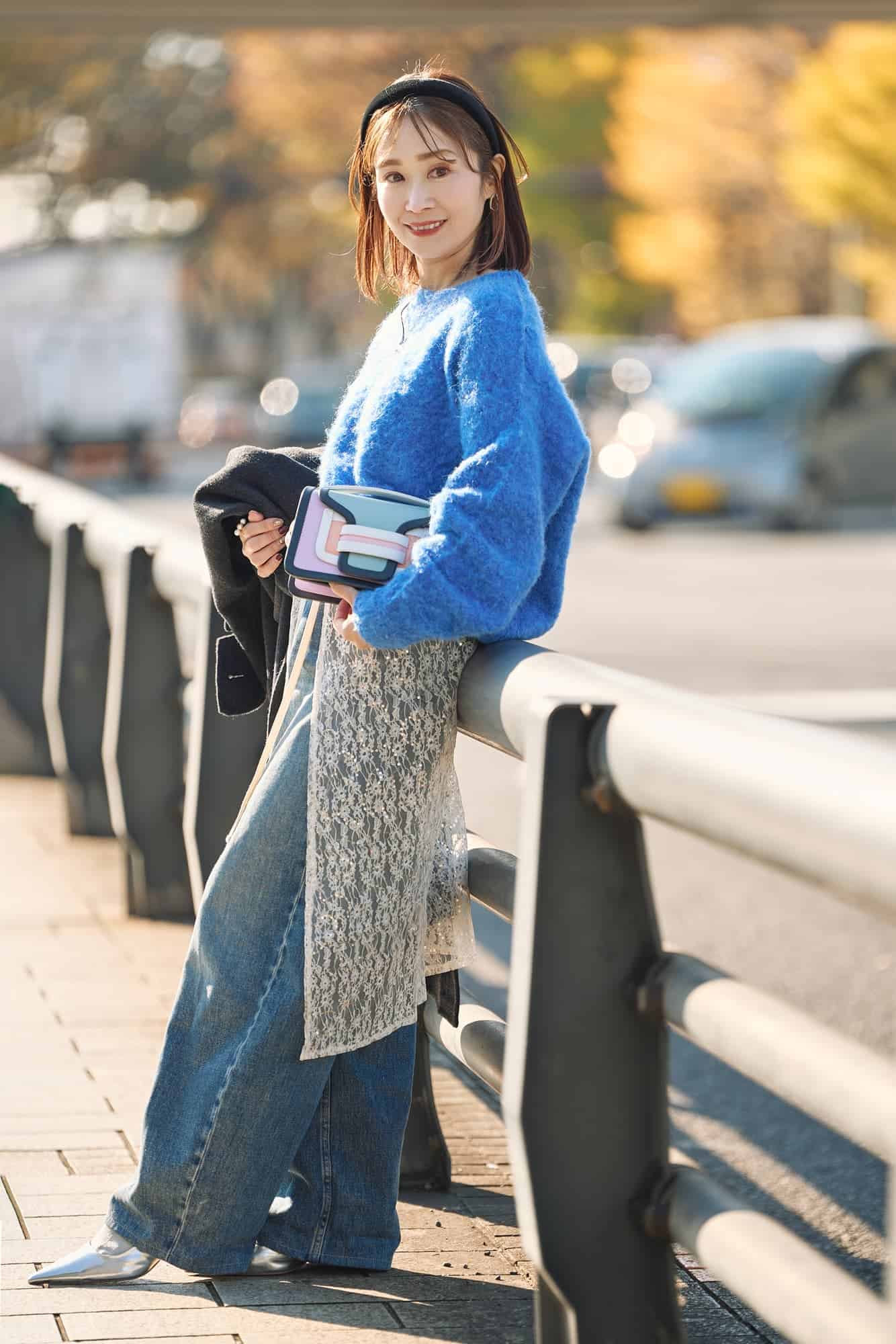 パキッとしたブルーのニットにデニムを合わせて、ブルーのグラデーションコーデに。太めのバギーカーブデニムに、ラメ入りのラップレースを巻いて女性らしさとトレンド感をプラス。キラキラ光るラップレースがコーデのアクセントになります。カチューシャで可愛らしさを、バッグにはカラーを取り入れて小物にもこだわっています。