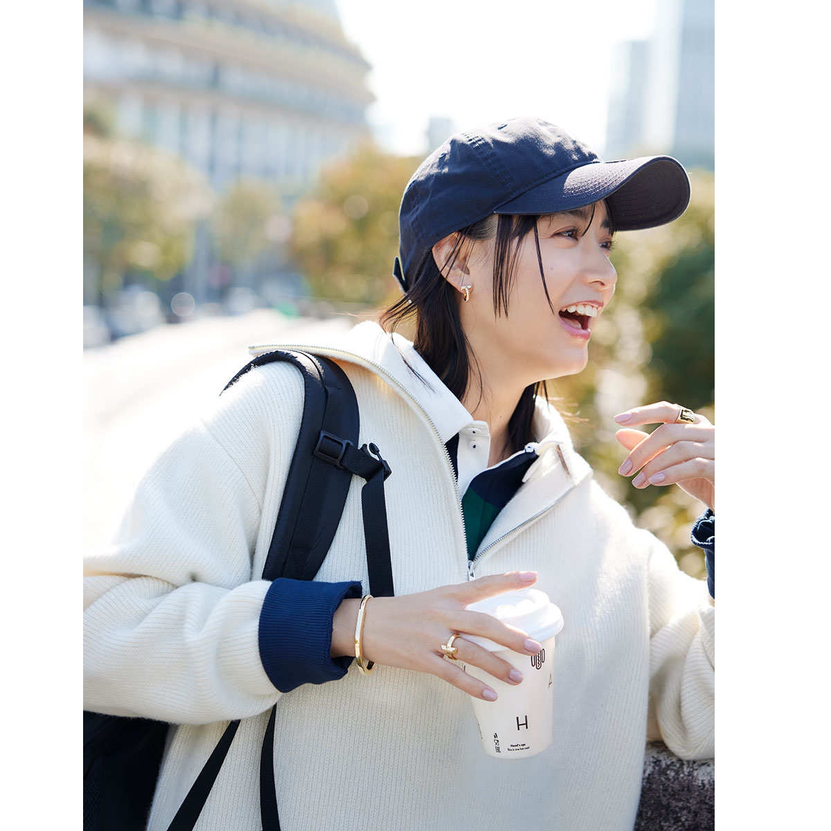 誰とでも自然に笑い合える人。そんな親しみやすい魅力を映すのは、ティファニーのジュエリー。ニューヨークの街のように、自由で、前向きで、どこか軽やか。そのポジティブなエネルギーを象った「ティファニー T」をはじめとする、アイコニックなデザインの軌跡をたどって。右腕バングル「ティファニー ロック」バングル〈YG〉¥1,232,000 右薬指リング「ティファニーT ワン」リング〈YG〉¥495,000 左人差し指リング「エルサ・ペレッティ™」スプリット リング〈YG〉¥819,500 着用ピアス「ティファニー T ワン」フープ ピアス〈YG×D〉¥797,500(すべてティファニー/ティファニー・アンド・カンパニー・ジャパン・インク)ニット¥25,300(アニュアル/ジャック・オブ・オール・トレーズ プレスルーム)プルオーバー¥13,200〈ローガン ニッティング ミルズ × シップス〉キャップ¥4,620〈ニューエラ × シップス〉(ともにシップス インフォメーションセンター)バックパック¥12,100(オーバーラボ)