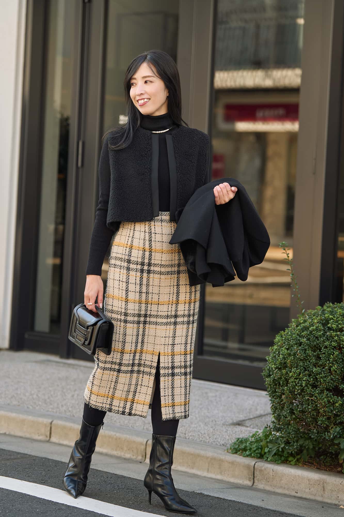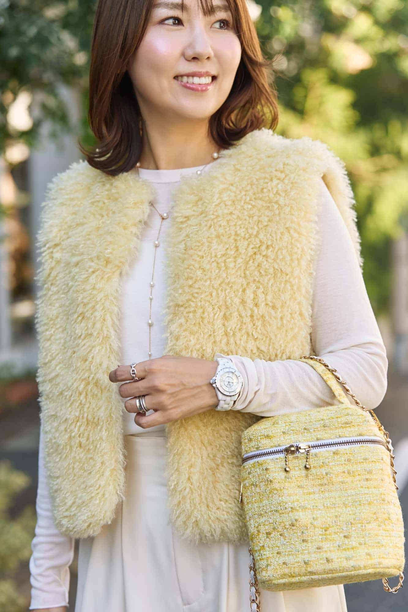 冬は暗い色の洋服が多くなりがちなので、気分が明るくなるようなイエローのジレとツイードのバニティバッグを主役にコーデを組みました。季節感に囚われすぎず、自分が好きな色、自分に似合う色をいつも楽しみたいと思っています。オフホワイトとたまごイエローの可愛い色味の組み合わせなので、ワイドパンツとオーバーサイズのコートをパサっと羽織り、落ち着いた大人っぽい要素も加えています。