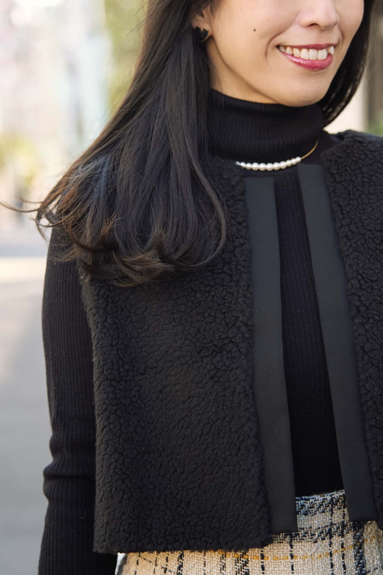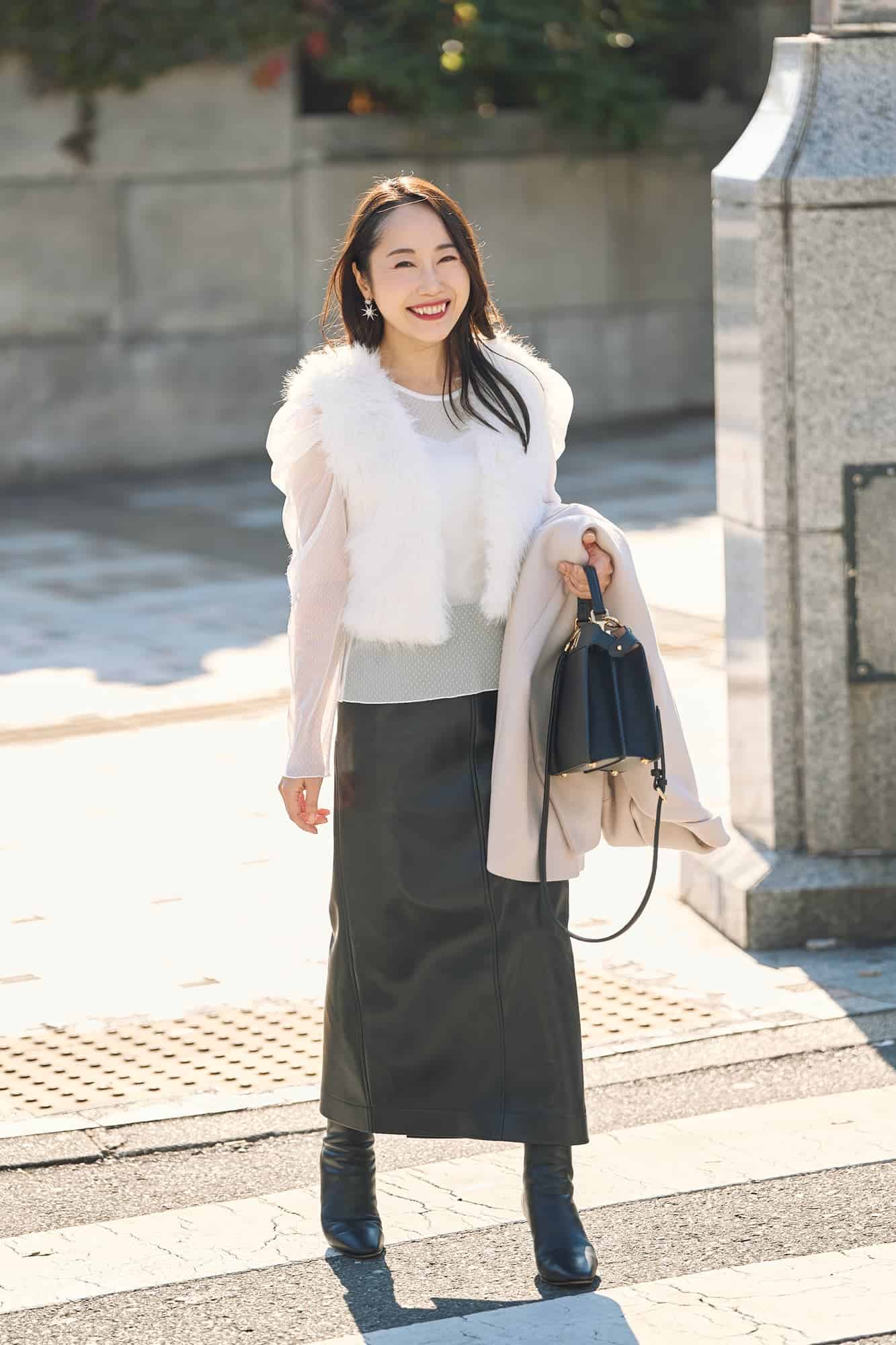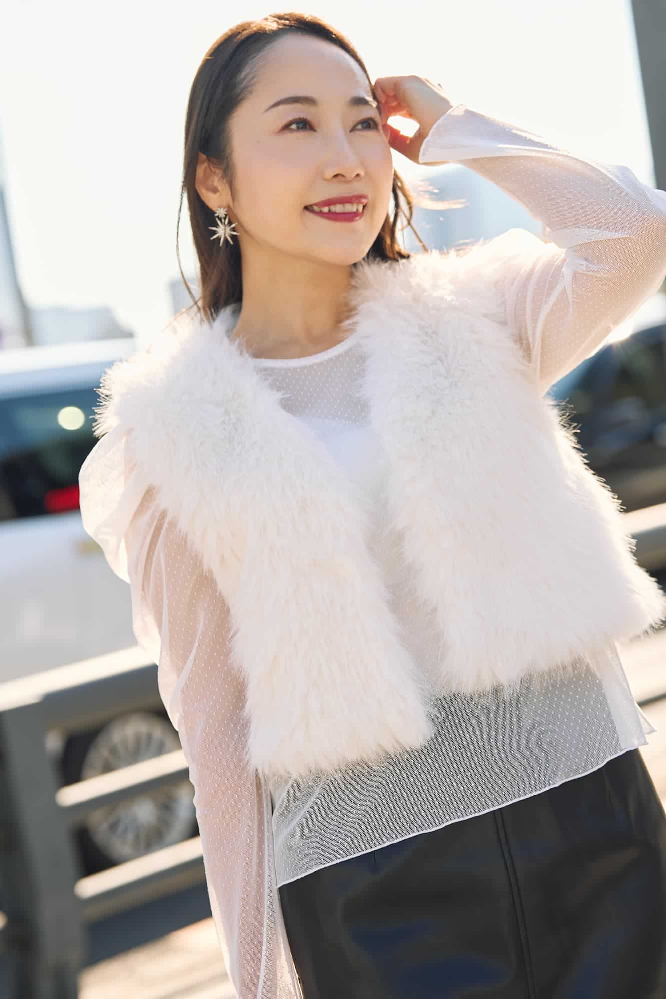 上半身の厚みと低身長がやや気になるポイントなので、ファーを着る時は「着ぶくれ」回避を意識。選んだのは「Vネック×ショート丈」のジレです。首元の抜け感とショート丈でスタイルアップを狙いました。ボトムスはタイトなレザースカートで縦ラインを作り、インナーにシアーなパフスリーブを合わせることでさりげなくお腹周りや肩回りをカバー。華やかさとスタイルアップの両立を目指しました。