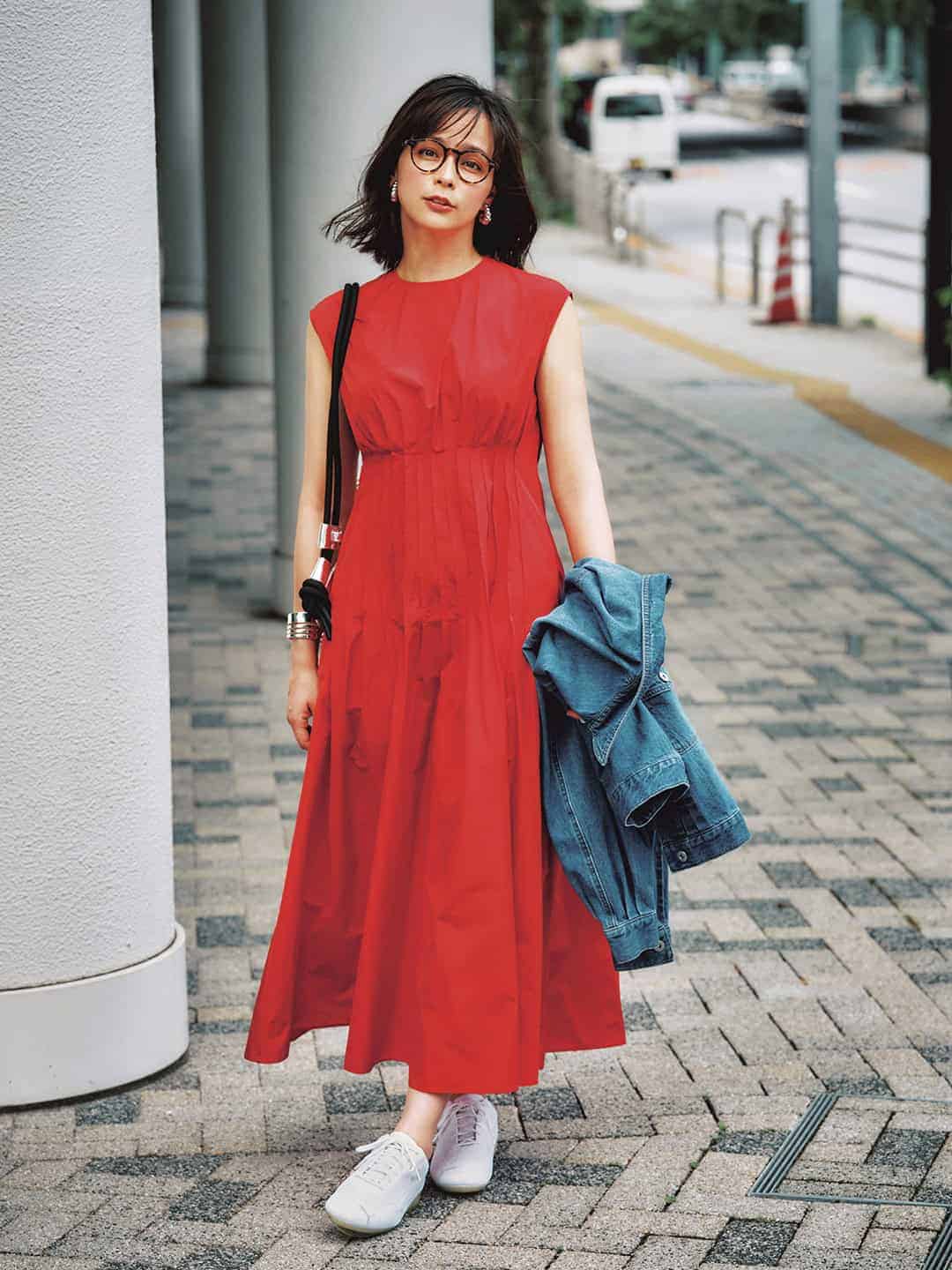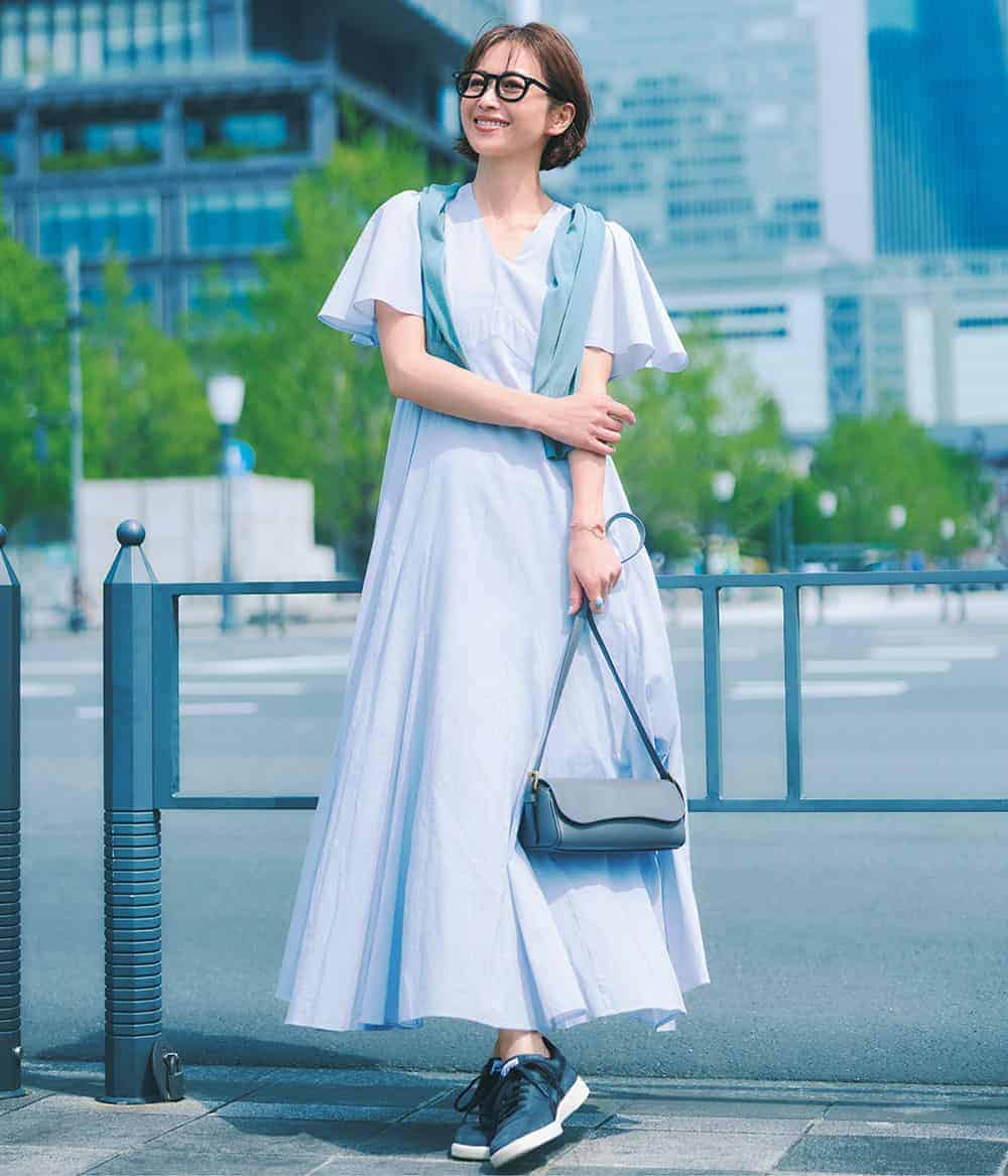 スニーカー¥12,560(アシックス/アシックスジャパン カスタマーサポート部)ワンピース¥41,800リング¥330,000(ともにマリハ)カーディガン¥15,400(アンクレイヴ)バッグ¥141,900J&M デヴィッドソン/J&M デヴィッドソン カスタマーセンター)メガネ¥46,200(アイヴァン/アイヴァン 東京ギャラリー)バングル¥14,300(マークスティールジュエリー/ココシュニック 新宿タカシマヤ店)