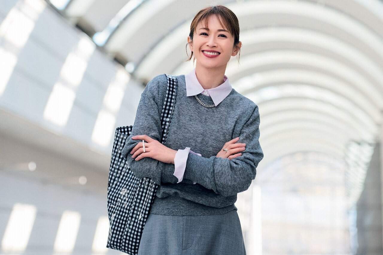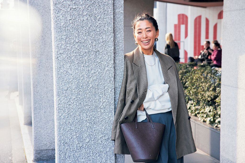 スニーカー¥41,800(デイト/ティースクエア プレスルーム)コート¥20,900(ミラ オーウェン/ミラ オーウェン ルミネ新宿2店)ニットジャケット¥48,400(ルームエイト/オットデザイン)ブラウス¥46,200(エステータ/オンワード樫山 お客様相談室)パンツ¥53,900(ebure〈リトルリーグ インク〉)バッグ¥209,000(ピエール アルディ/ピエール アルディ 東京)ピアス¥20,900(シャルロットウーニング/フラッパーズ)時計/スタイリスト私物)