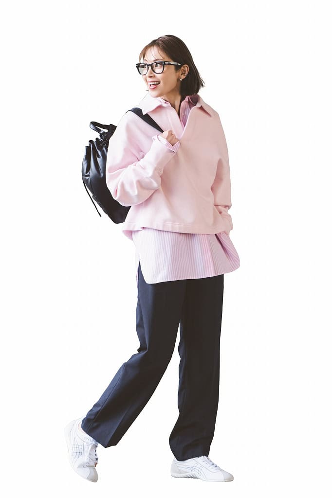 スニーカー¥20,900(オニツカタイガー/オニツカタイガージャパン)スウェット¥9,460シャツ¥8,910(ともにミラ オーウェン/ミラ オーウェン ルミネ新宿2店)パンツ¥36,300(ホリデイ/フラッグシップサロン オフィス)リュック¥49,500(ハンター/ハンタージャパン カスタマーサービス)ピアス¥44,000イヤーカフ¥41,800(ともにプライマル)メガネ¥49,500(モスコット/モスコット トウキョウ)