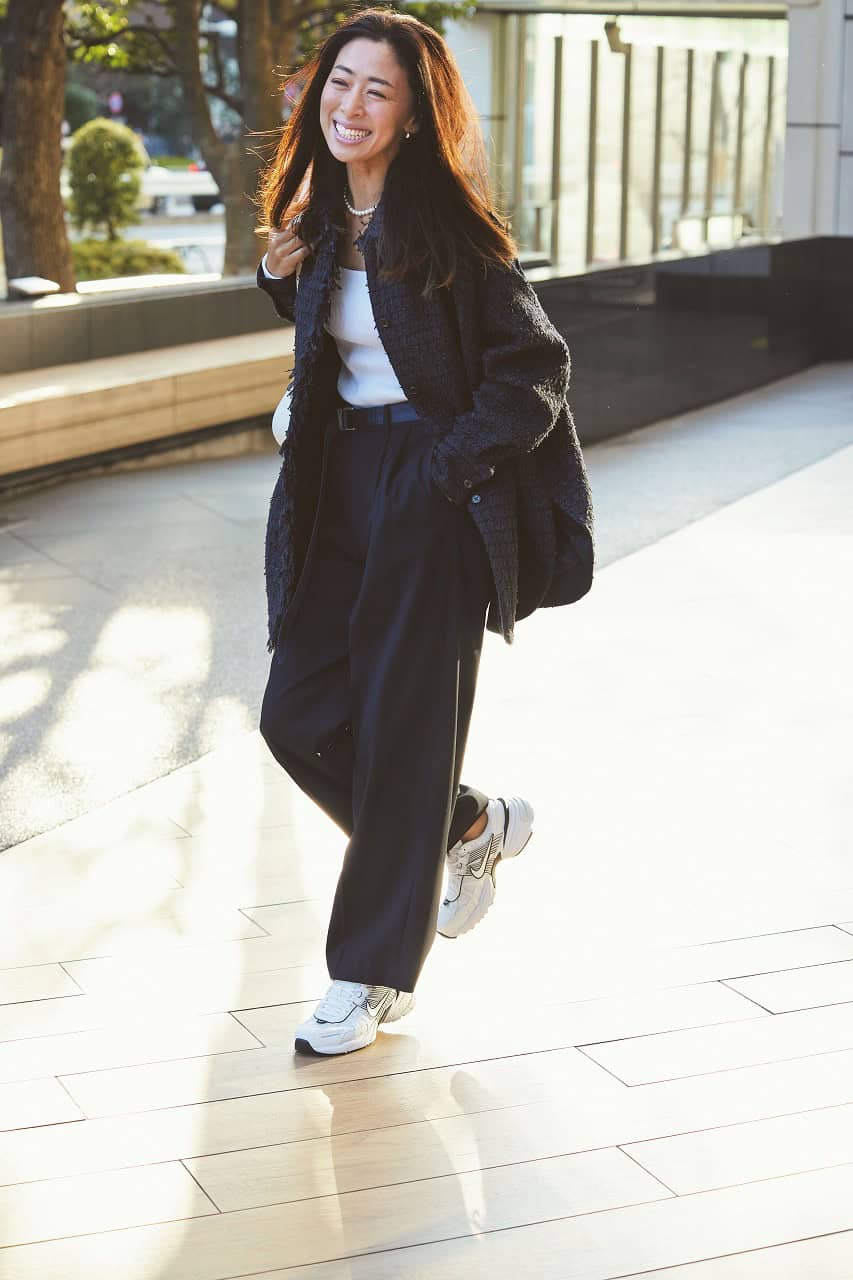 黒ワントーン×白ジャケットのシックな装いには、オニツカタイガーのロゴがアクセントとして最適。黒ズボンに黒の一足を合わせると脚長効果も。キレイめコーデにスポーティさを少量ミックスして、40代らしい都会的なこなれ感に仕上がります。